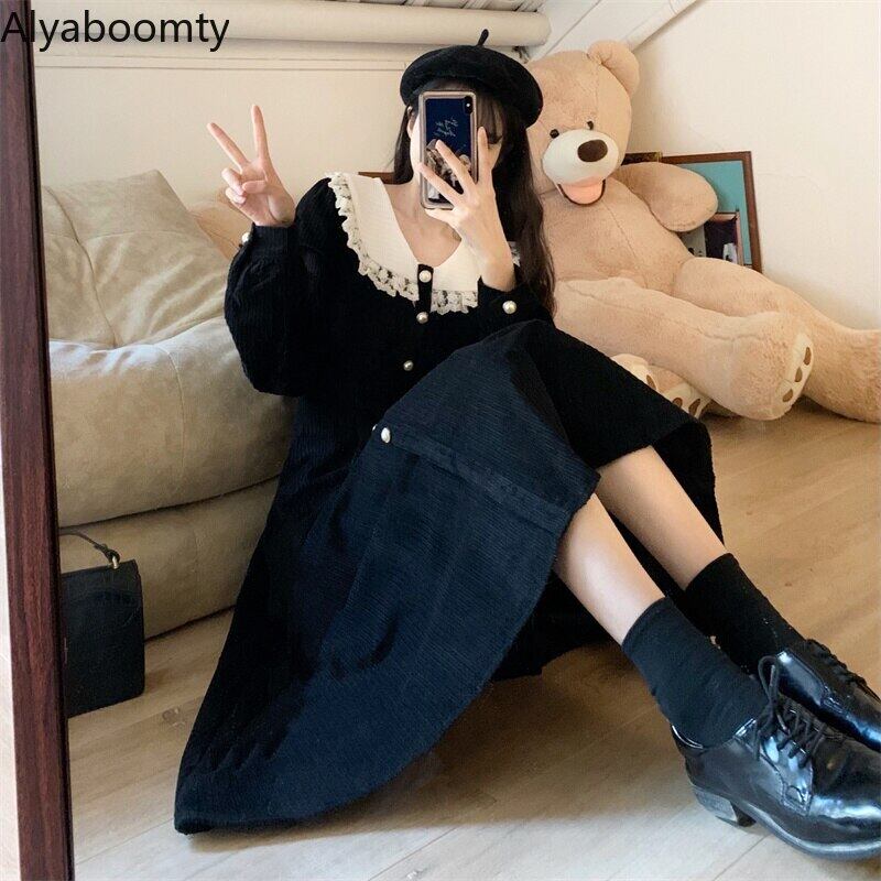 送料無料୨♥୧ オータムウィンターレディースブラックドレス カラーレースフリルヴィンテージコーデュロイロング ラッフル 大人ガーリー スウィート キュート カジュアル 秋物 冬物 ビンテージ AOS56768150593