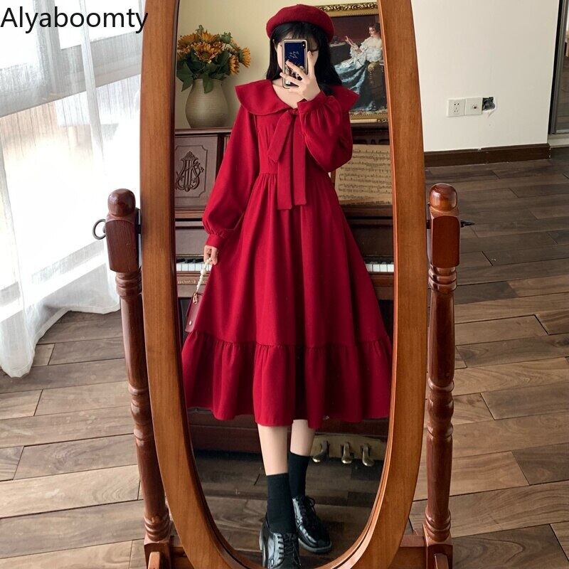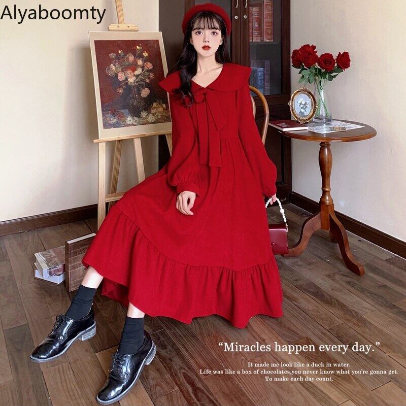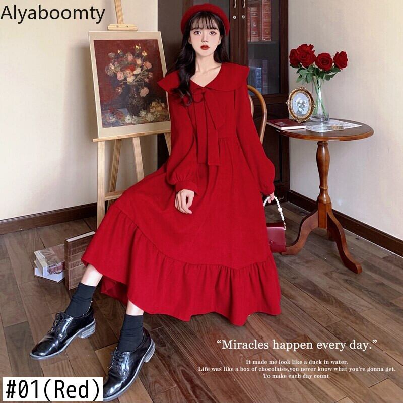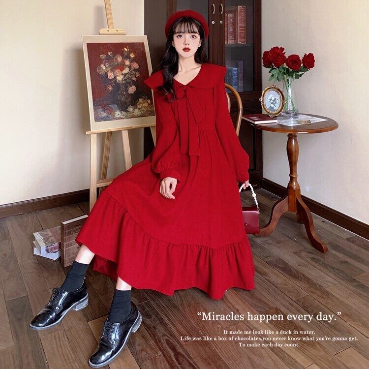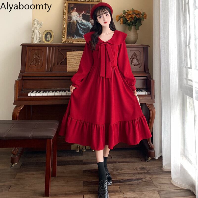 送料無料୨♥୧ eseプレッピースタイルスプリングオータムレディースピーターパンカラーレッドリボン甘いドレス 可愛いフリルm-4xl AOS99278978297