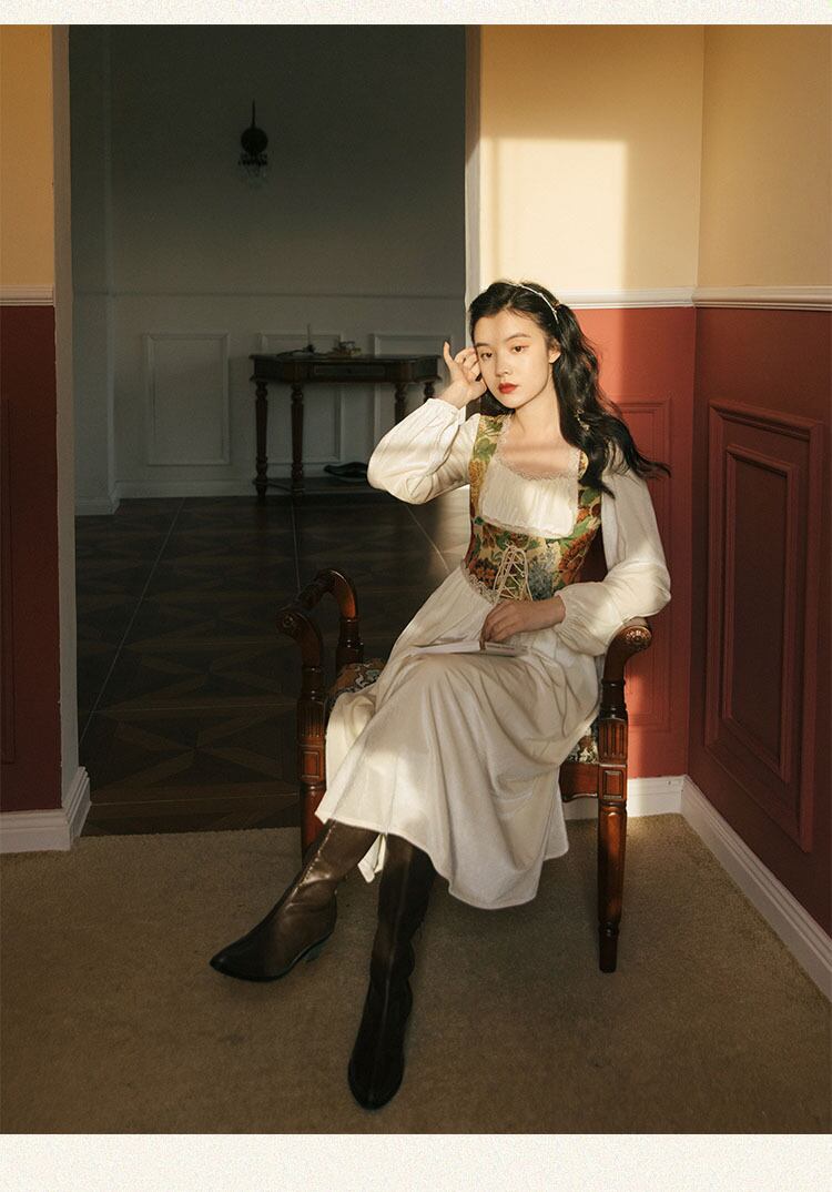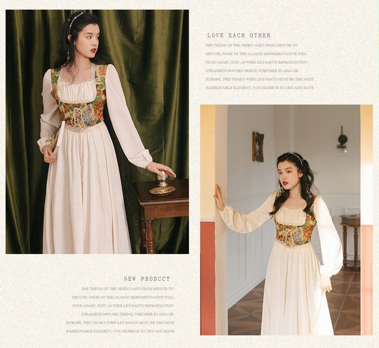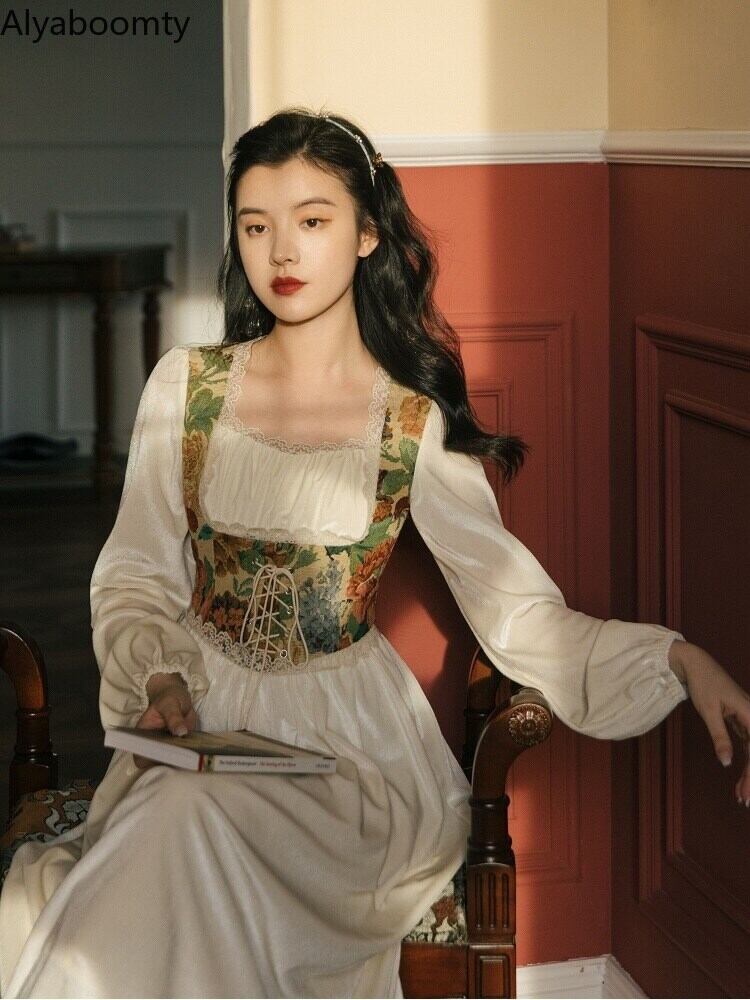 送料無料୨♥୧ スプリングオータムレディースヴィンテージロングドレス 平方カラーパッチワークレースバンドクリカル長袖スリーブ妖精 AOS44821944072