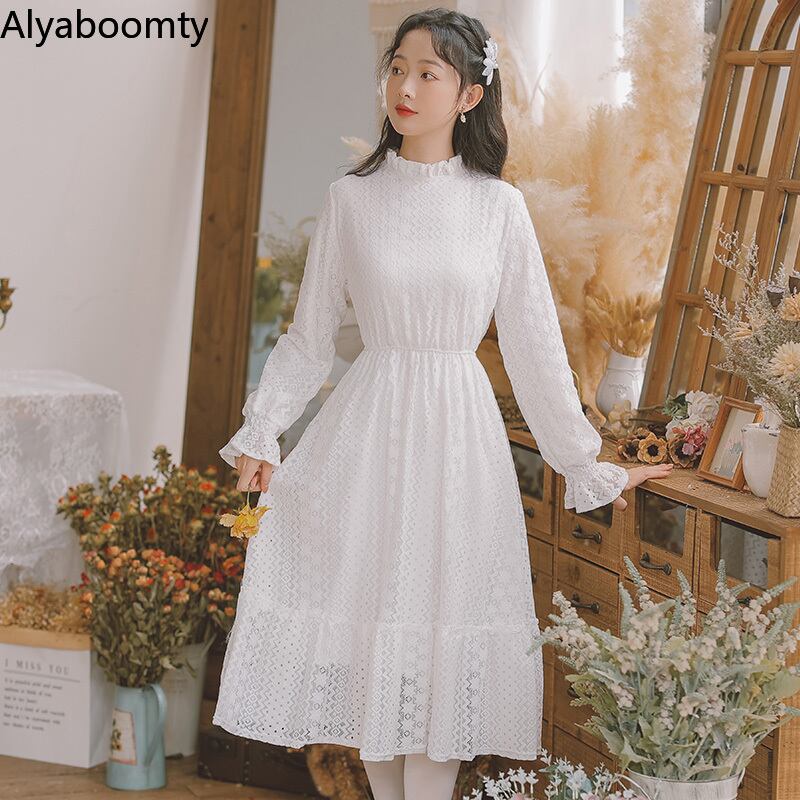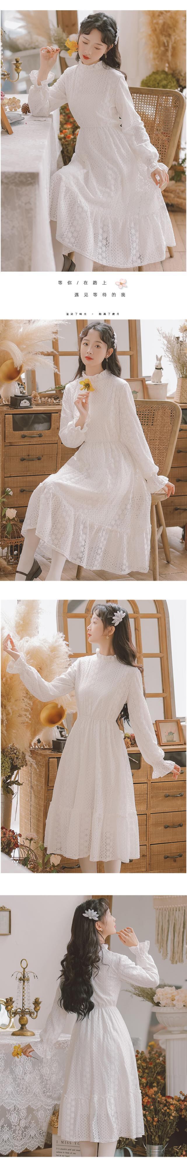 送料無料୨♥୧ 森オータムウィンターレディース繊細ドレス スタンドカラーカラーホワイトアプリコットホローでるレース甘いフリルミディ AOS82332562754