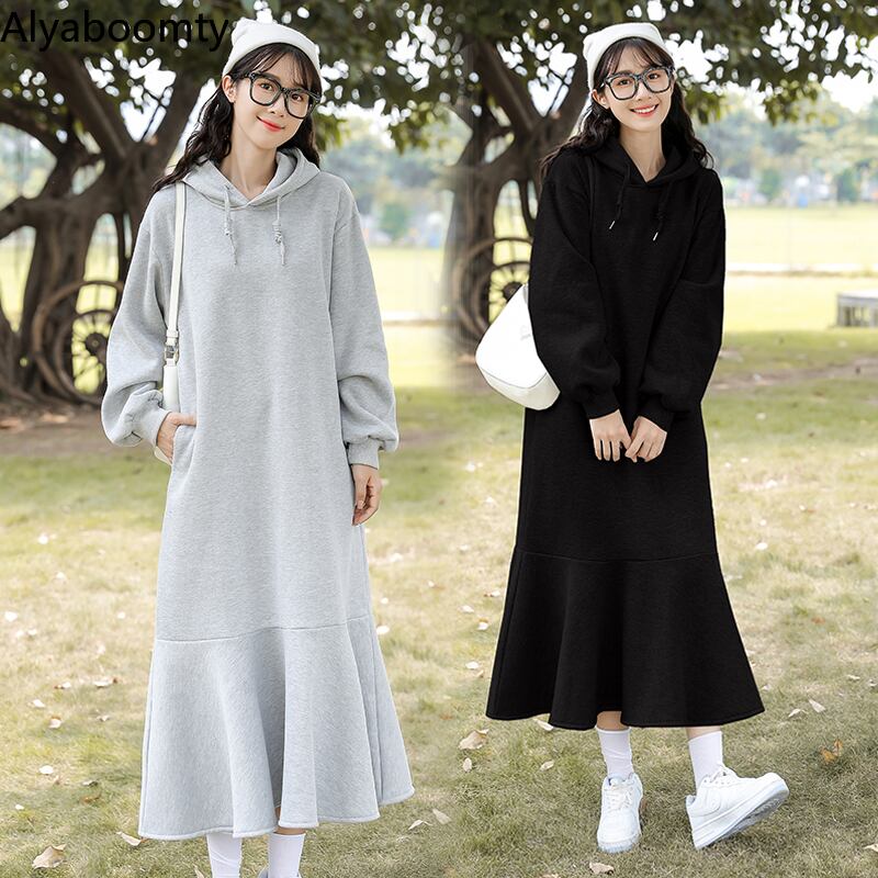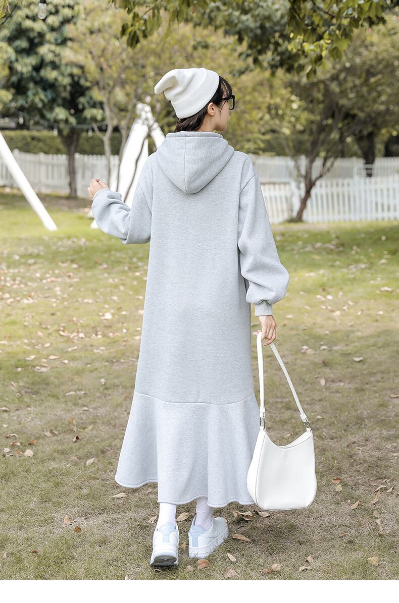 送料無料୨♥୧ オータムウィンターロングドレス フードブラックグレールーズフリル ラッフル パーカー 秋物 冬物 AOS95570694705