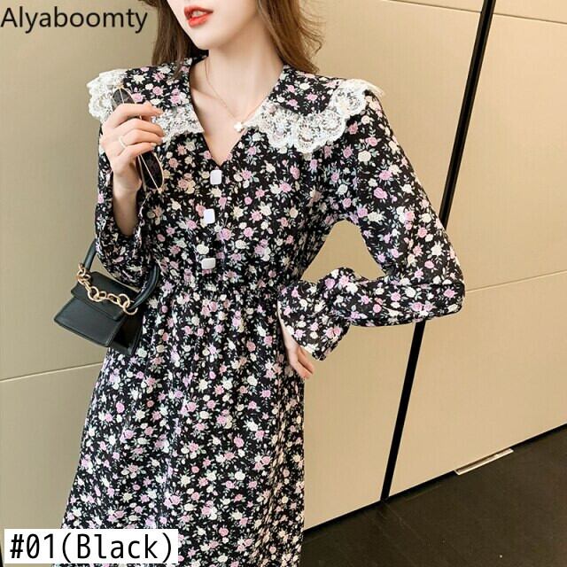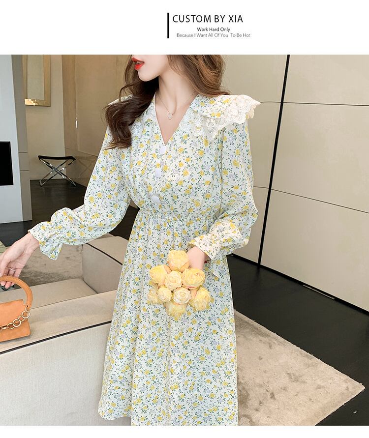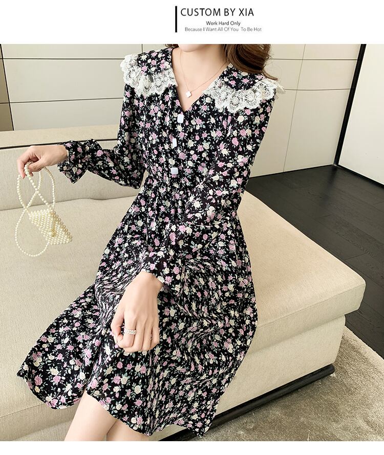 送料無料୨♥୧ スプリングオータムレディースドレス カラーレースフローラルプリント長袖スリーブ ロング 大人ガーリー スウィート キュート カジュアル 春物 秋物 花柄 AOS73359917528
