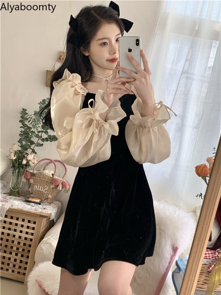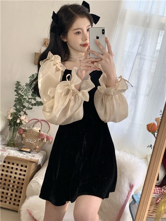送料無料୨♥୧ レディースブラックミニドレス パッチワークベルベットスリーブ かわいい AOS35395219523