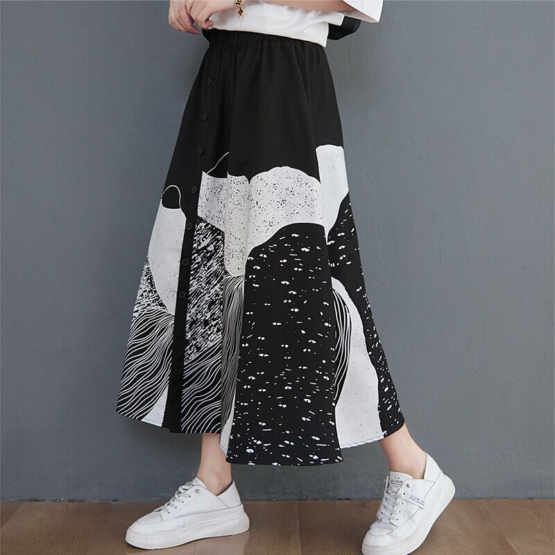 送料無料୨♥୧ スプリングサマーレディースミディスカート ウェストカラープリントヴィンテージスタンダードルーズAライン レトロ 春物 夏物 ビンテージ AOS2124574005