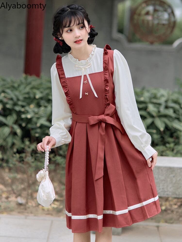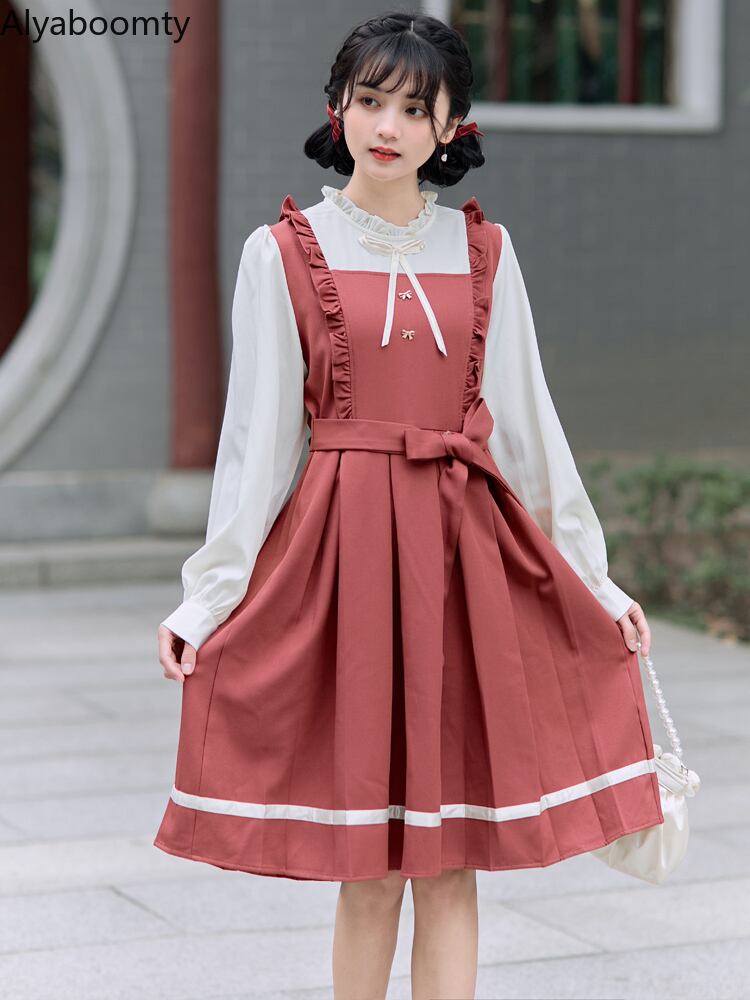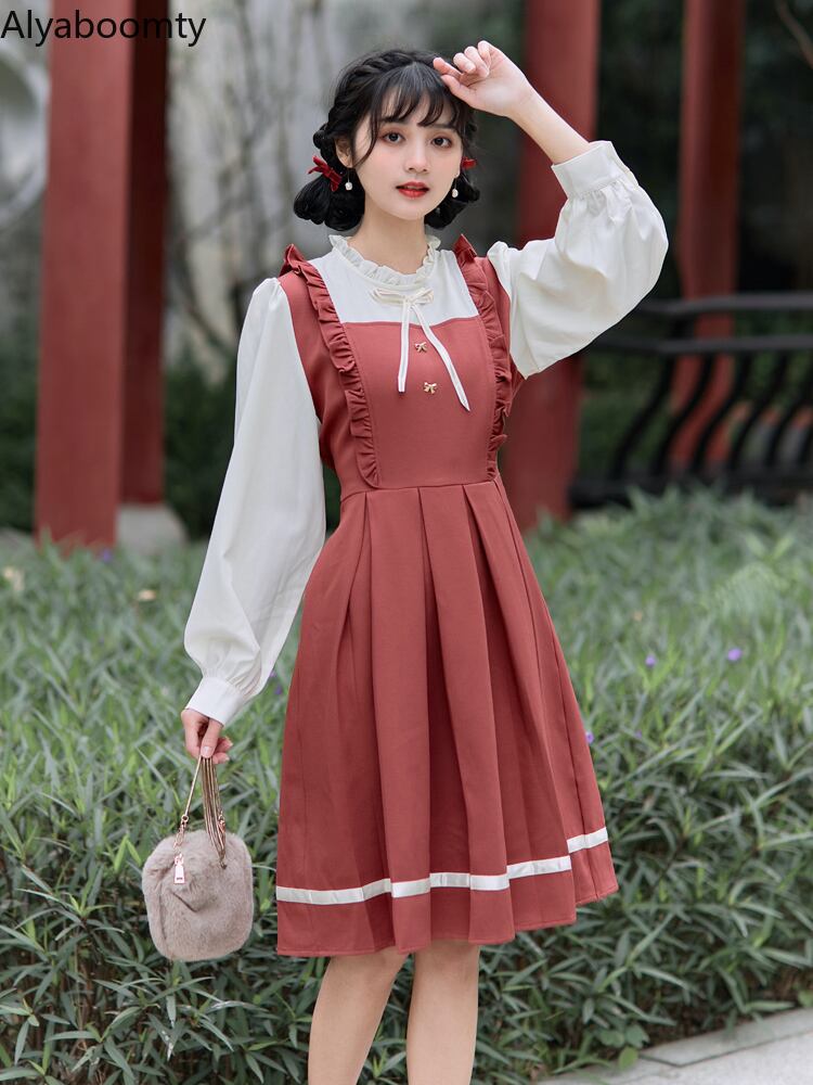 送料無料୨♥୧ スプリングオータムレディースドレス カラーパッチワークリボン長袖スリーブ ロング 大人ガーリー スウィート キュート カジュアル 春物 秋物 AOS19740818630
