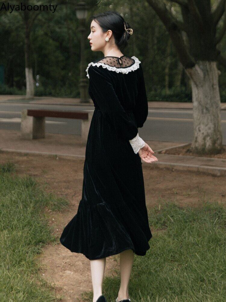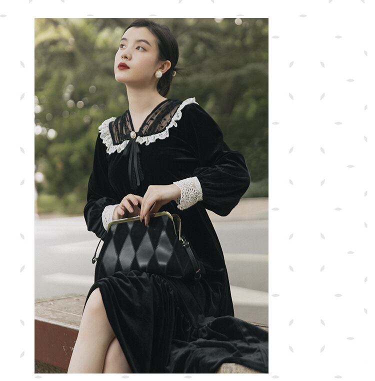 送料無料୨♥୧ オータムウィンターレディースブラックロングドレス カラーメッシュリボンベルベットヴィンテージフリルレース ラッフル 秋物 冬物 ビンテージ AOS86066802729
