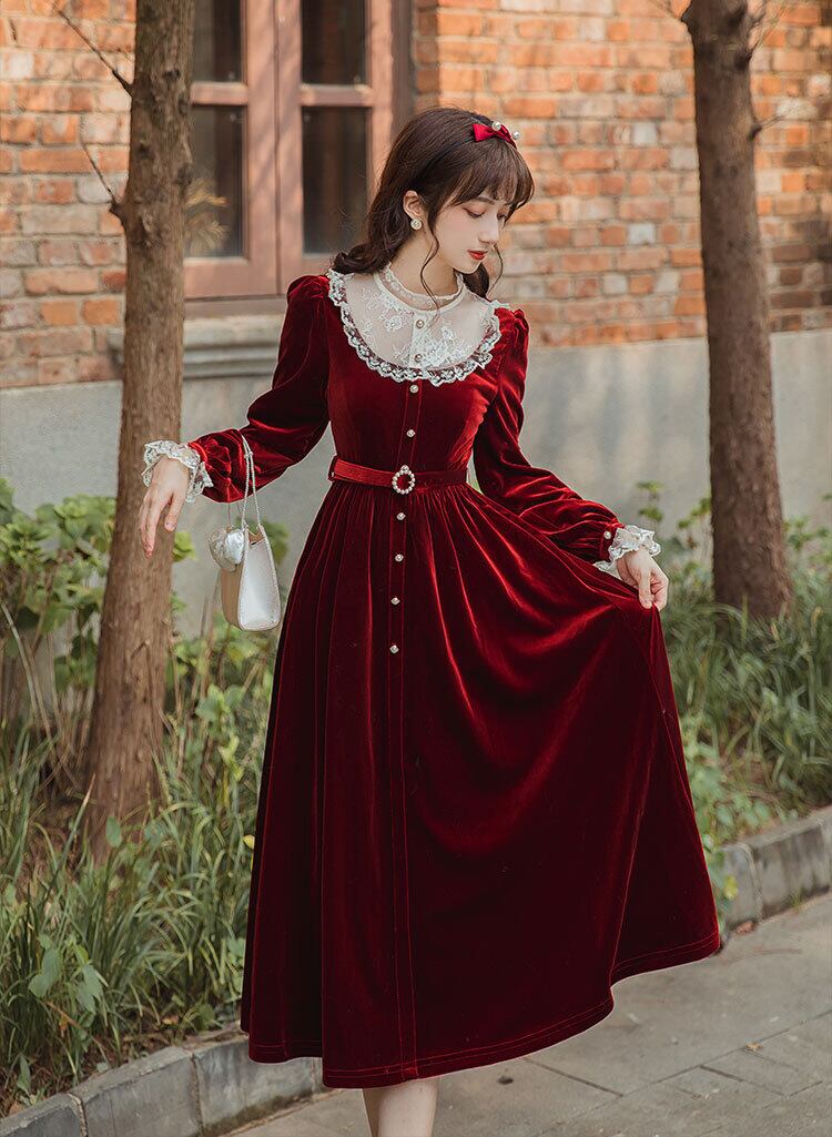 送料無料୨♥୧ スプリングオータムレディースドレス カラーレースパッチワークレッドベルト ベルベットミディ 春物 秋物 ハーネス AOS74572003060