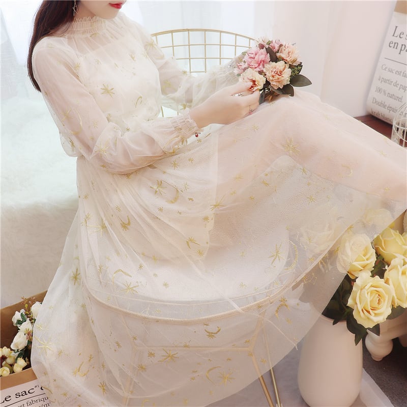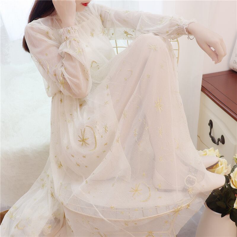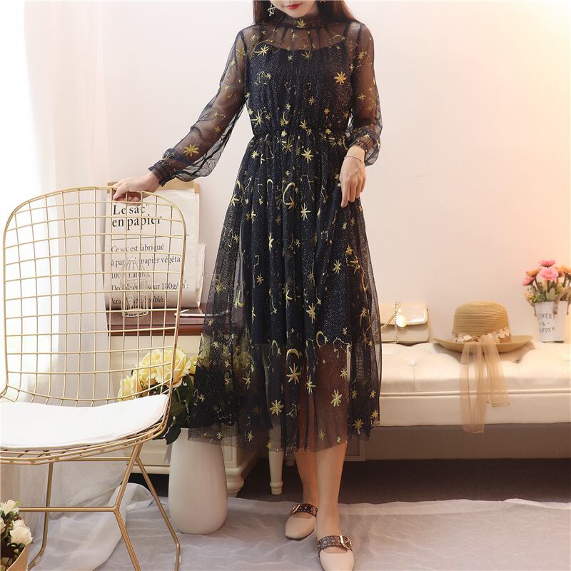 送料無料୨♥୧ スプリングオータムレディースミディドレス ベージュグレーネイビーブルー刺繍メッシュ 春物 秋物 AOS75745737235