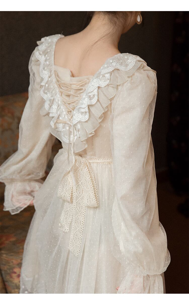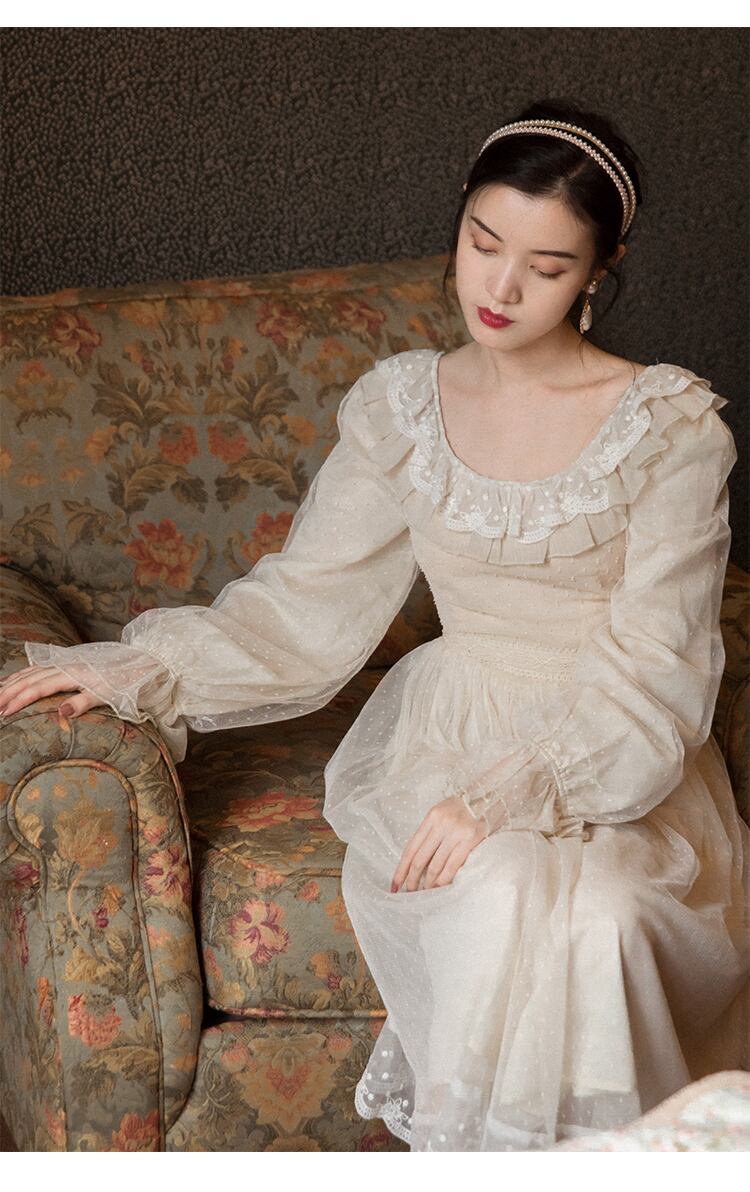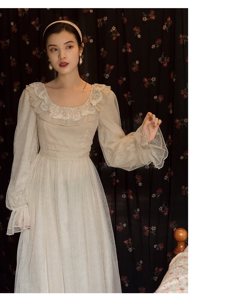 送料無料୨♥୧ スプリングレディースロングドレス 水玉バンドフリルスリーブ フレアスリーブ ラッフル 春物 Oネック AOS47261247353