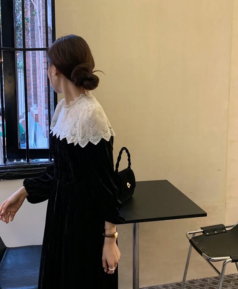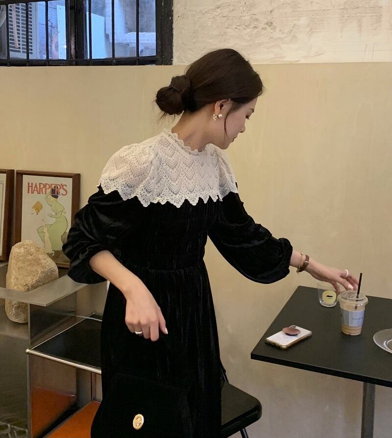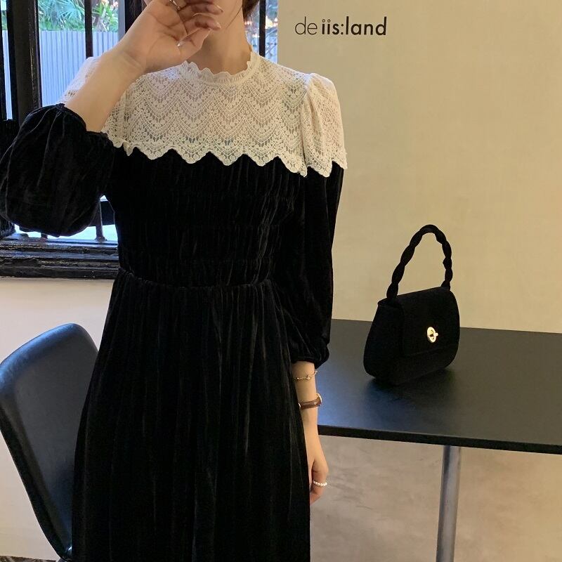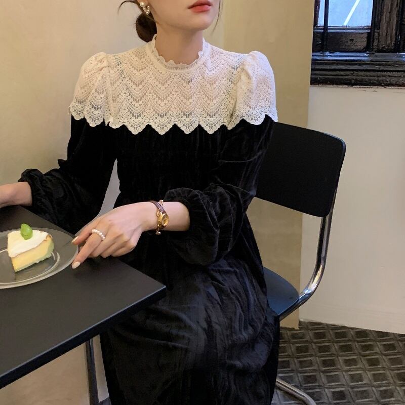 送料無料୨♥୧ スプリングオータムレディースロングドレス レースパッチワーク長袖スリーブブラックベルベット 春物 秋物 AOS2992910272