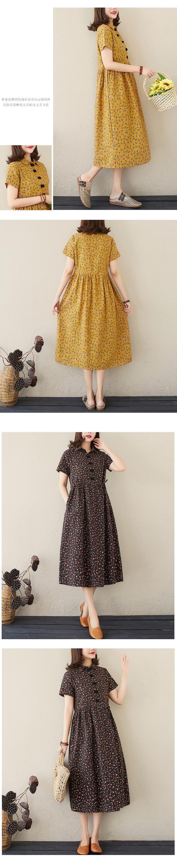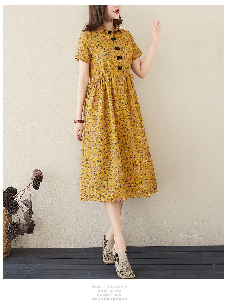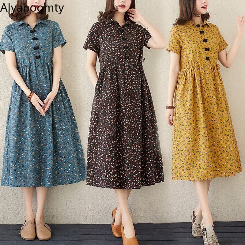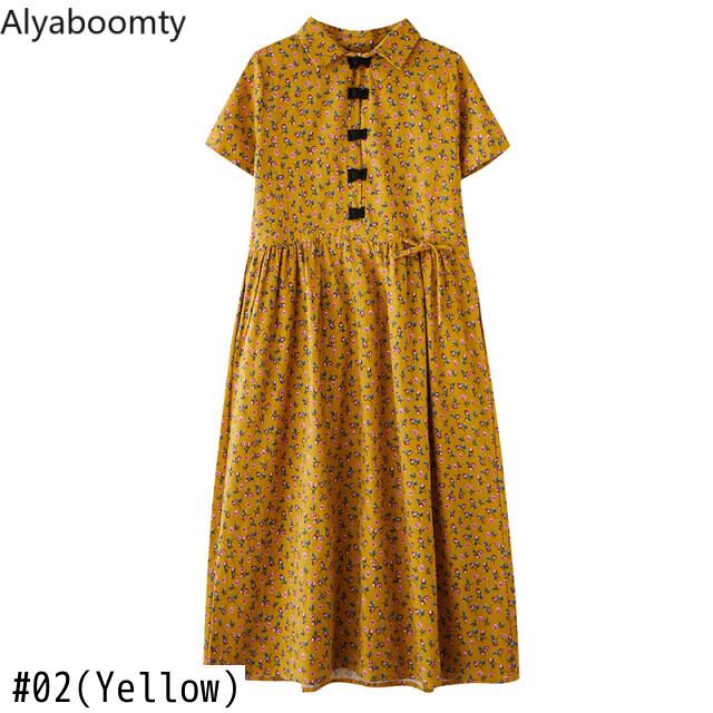 送料無料୨♥୧ サマーレディースヴィンテージミディドレス カラーフローラルプリント半袖スリーブロング ショート コットン ハーフスリーブ 夏物 花柄 ビンテージ AOS12645577649