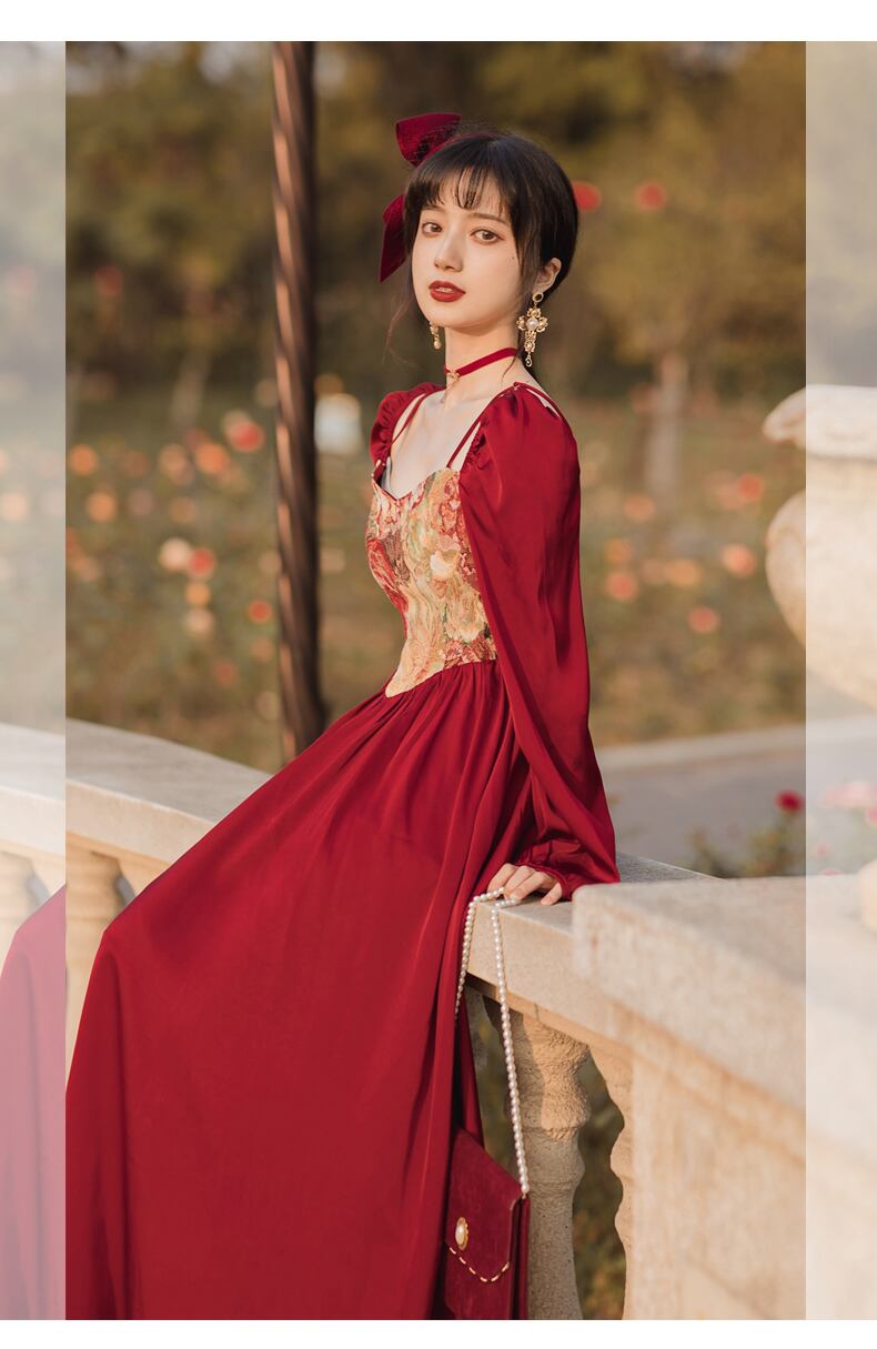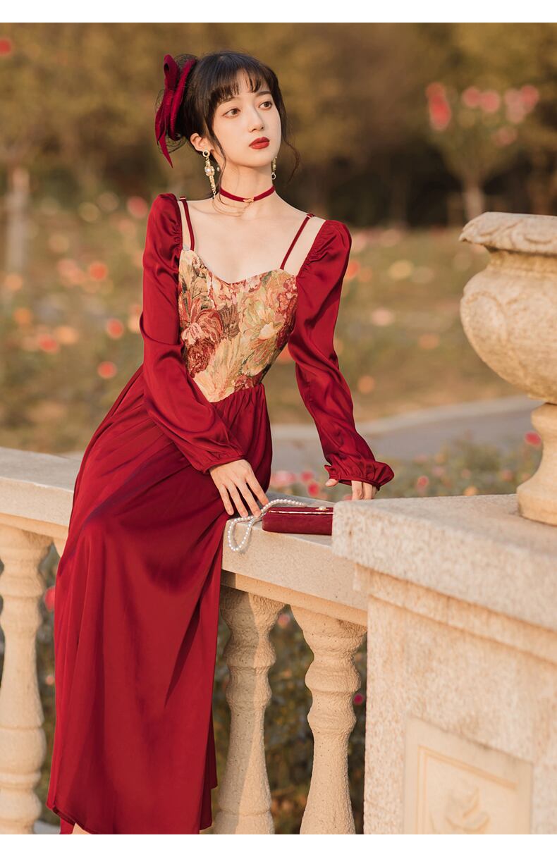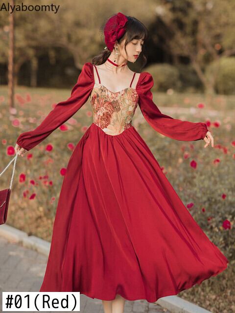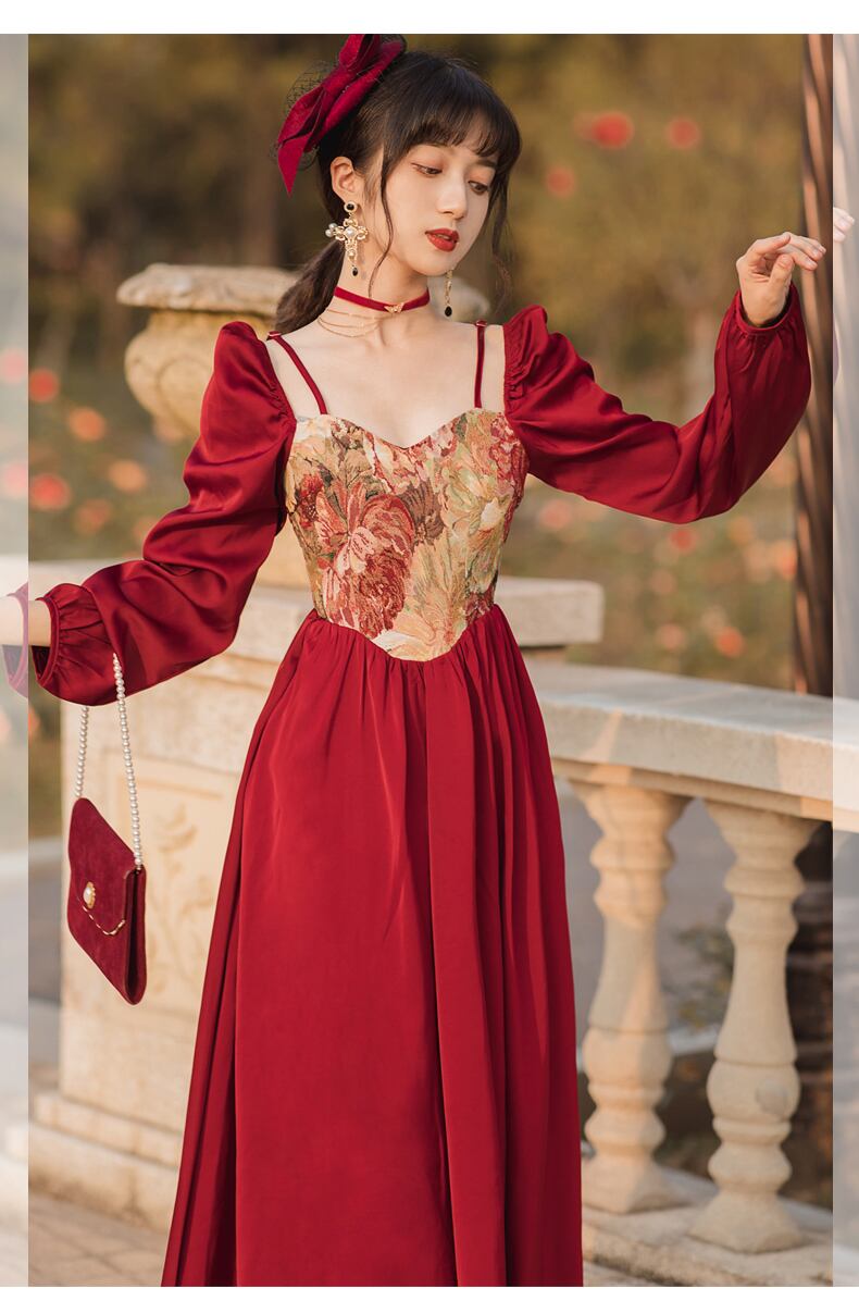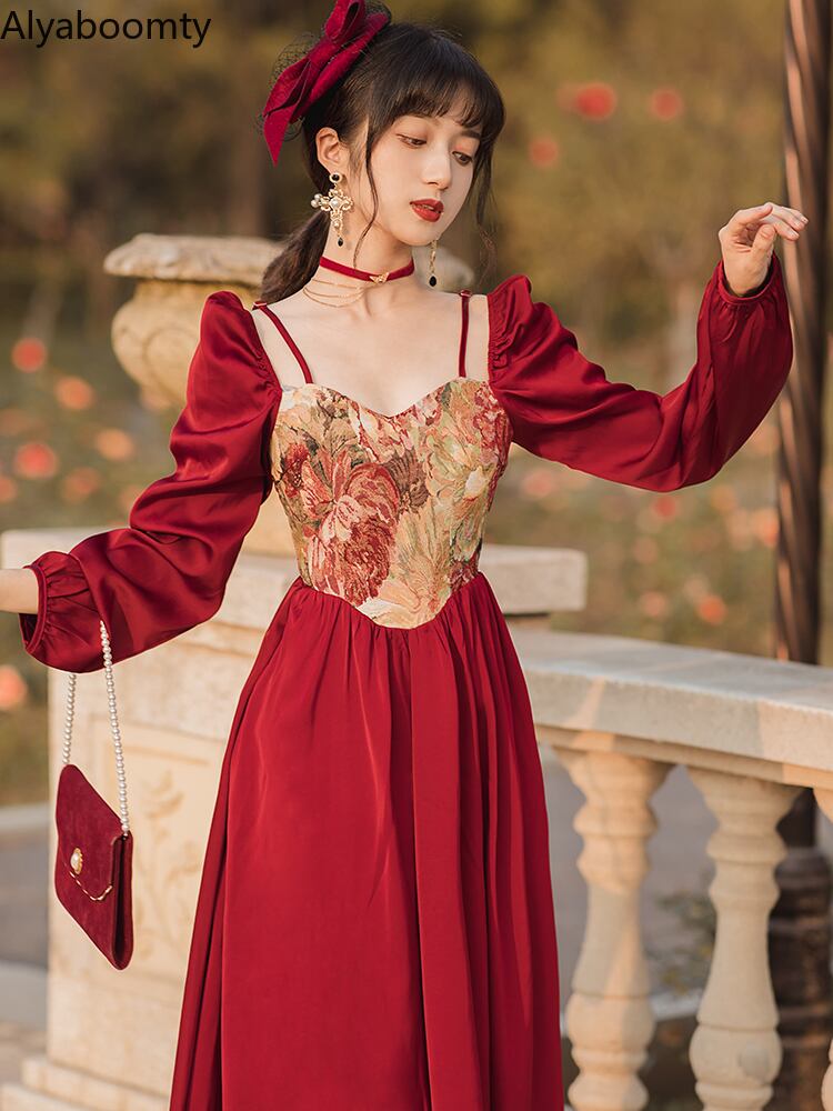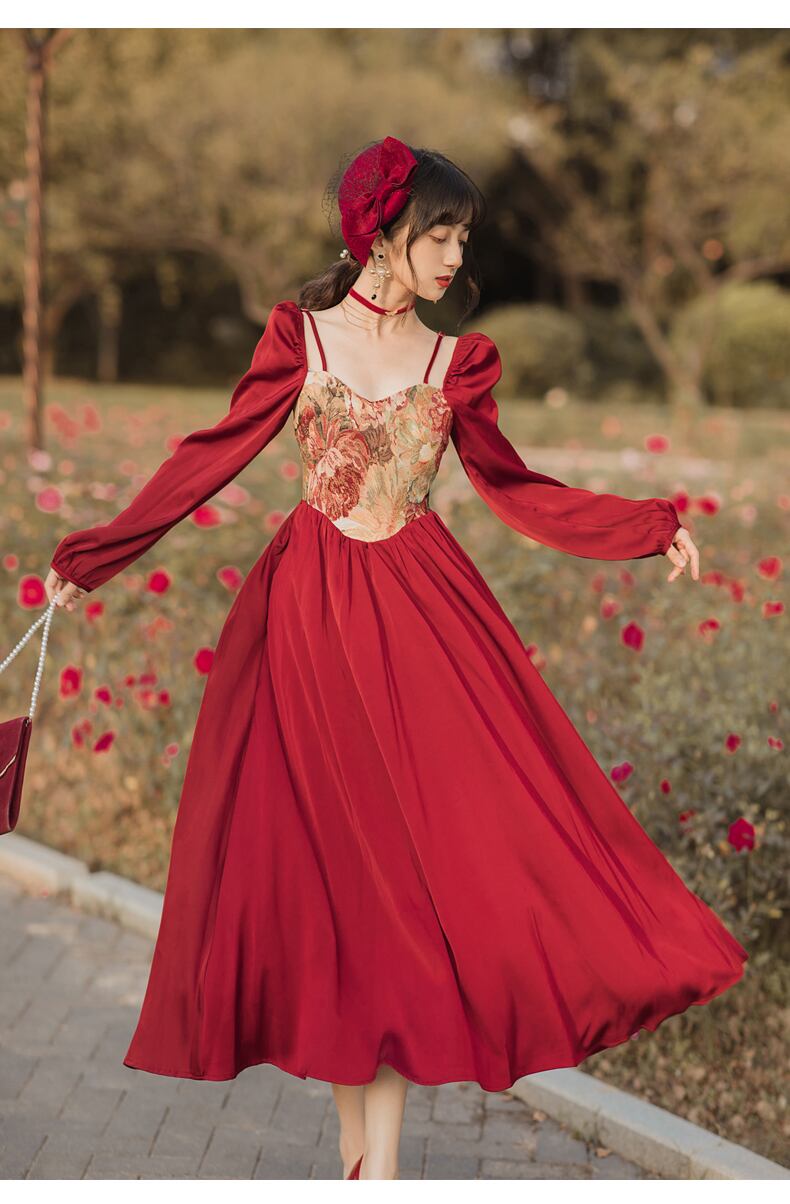 送料無料୨♥୧ スプリングオータムレディースロングスタンダードAラインドレス カラーレッドパッチワークスリーブミディ レトロ 春物 秋物 スクウェア AOS44739485009