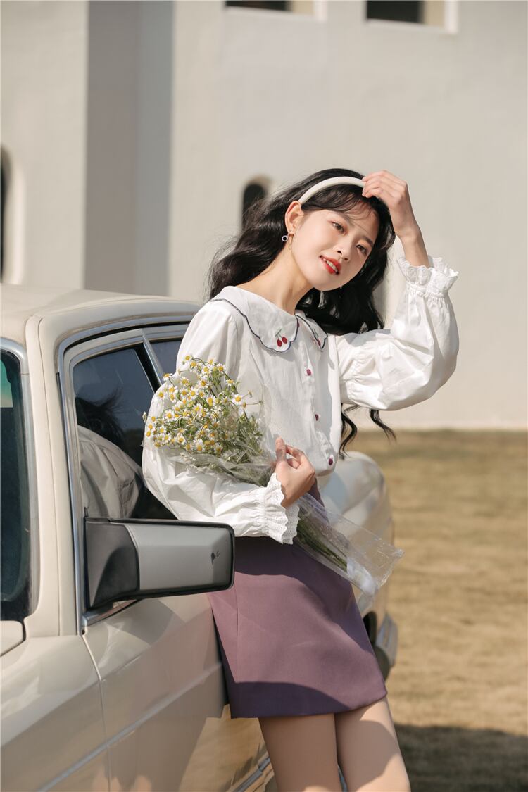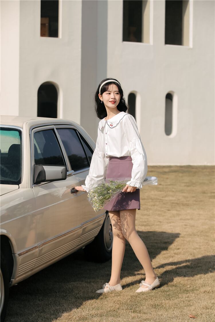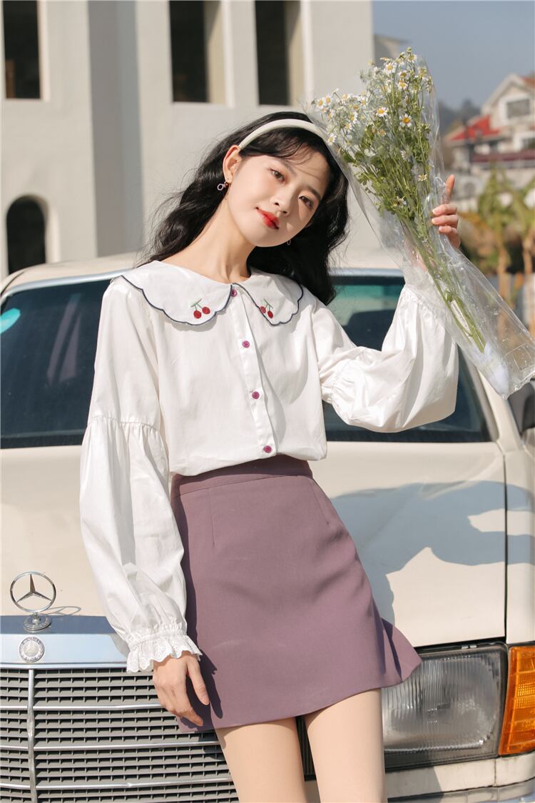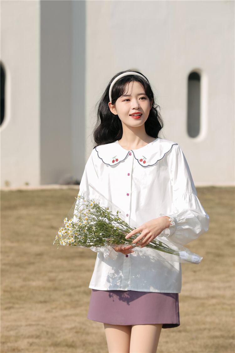 送料無料୨♥୧ スプリングオータムレディースブラウス カラー刺繍ホワイトスリーブルーズトップス コットン 大人ガーリー スウィート キュート カジュアル 春物 秋物 AOS38966645093