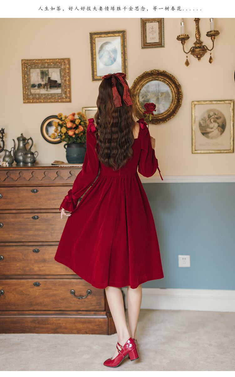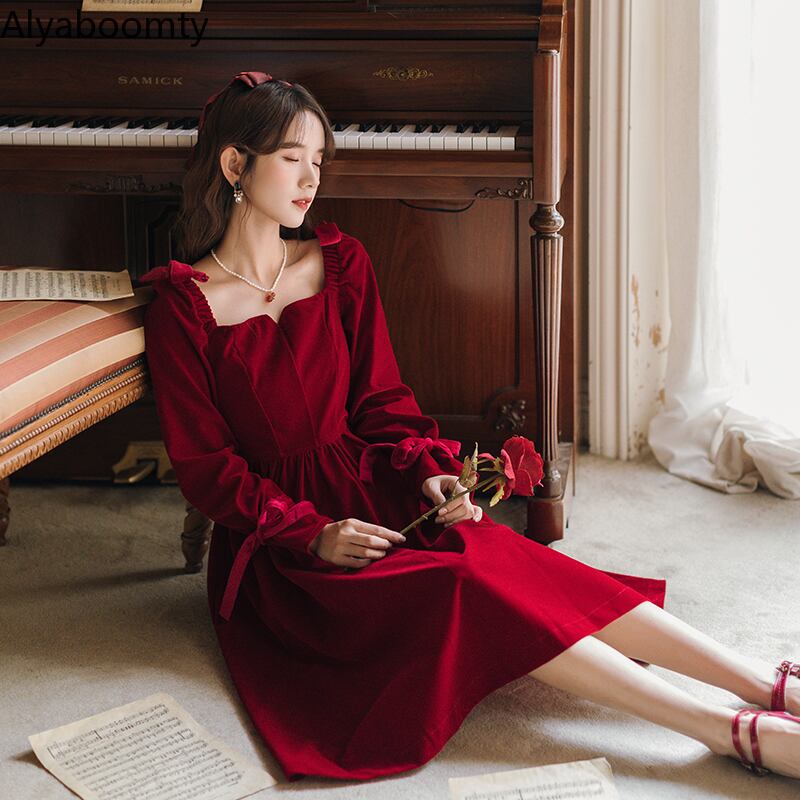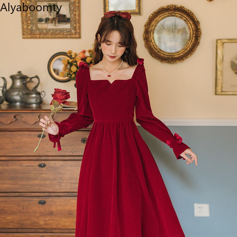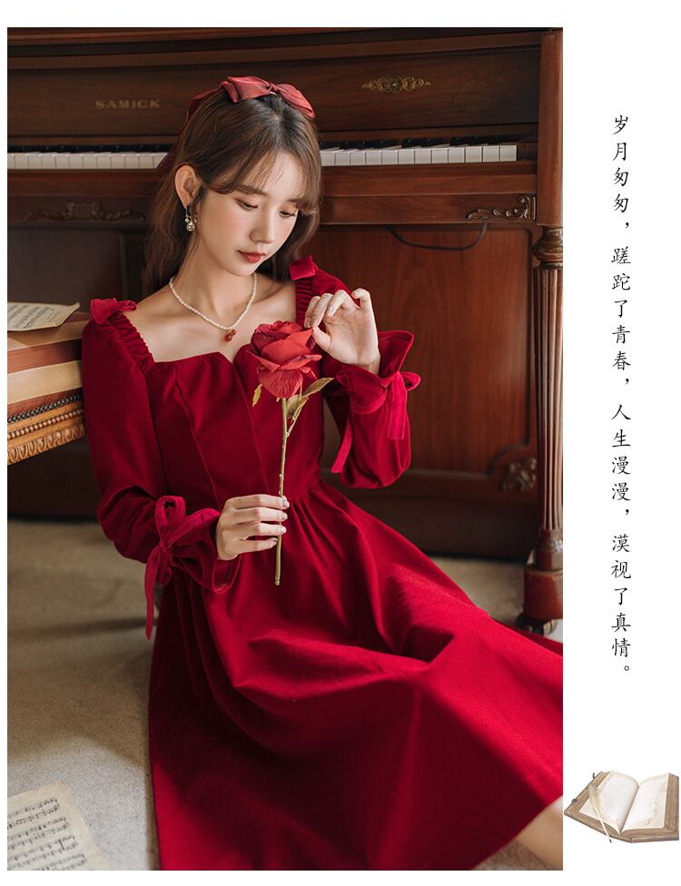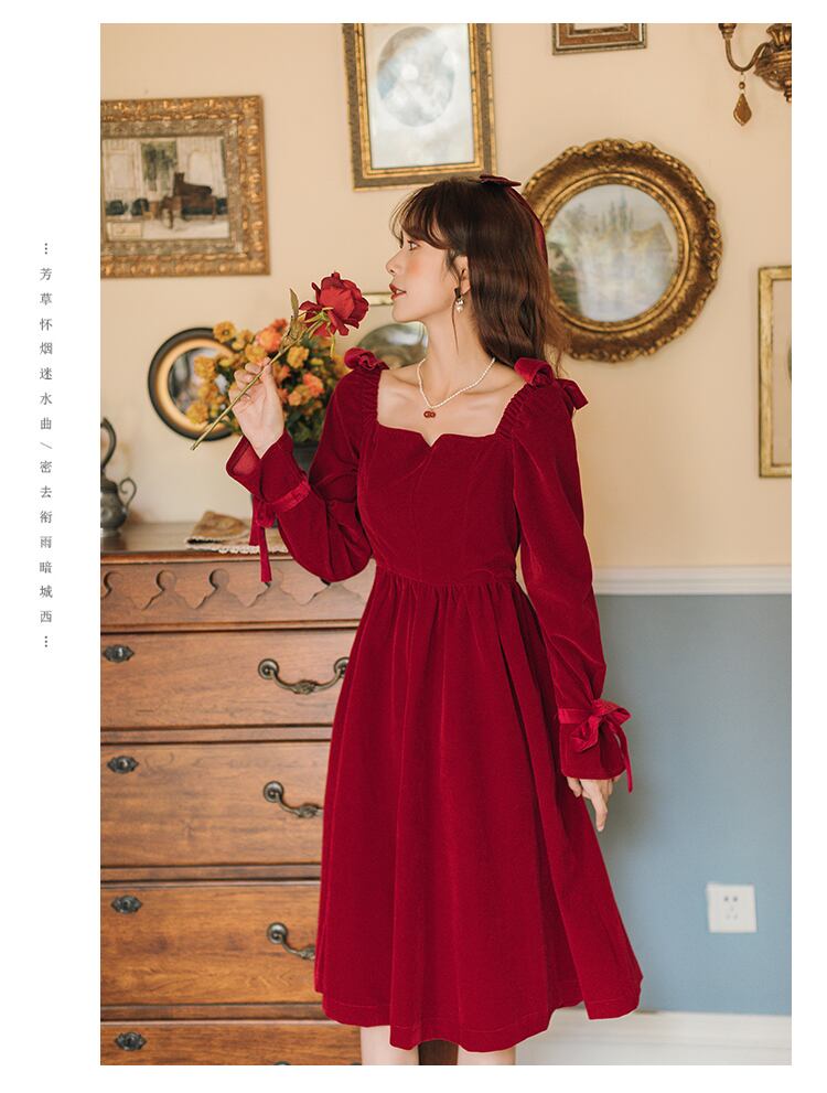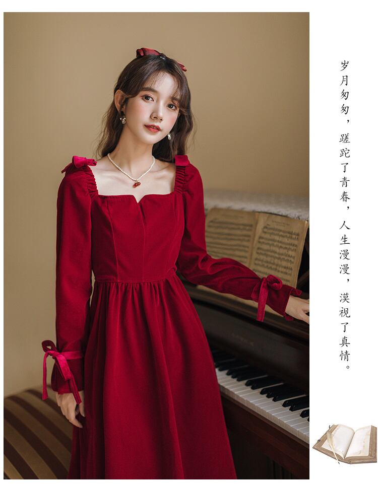 送料無料୨♥୧ スプリングオータムレディースレッドドレス カラーソリッド スリムヴィンテージリボン長袖スリーブベルベットドレス ワンピース ロング 大人ガーリー スウィート キュート カジュアル 春物 秋物 ソリッドカラー スクウェア ビンテージ AOS29735709662