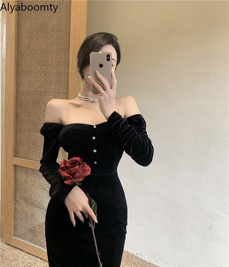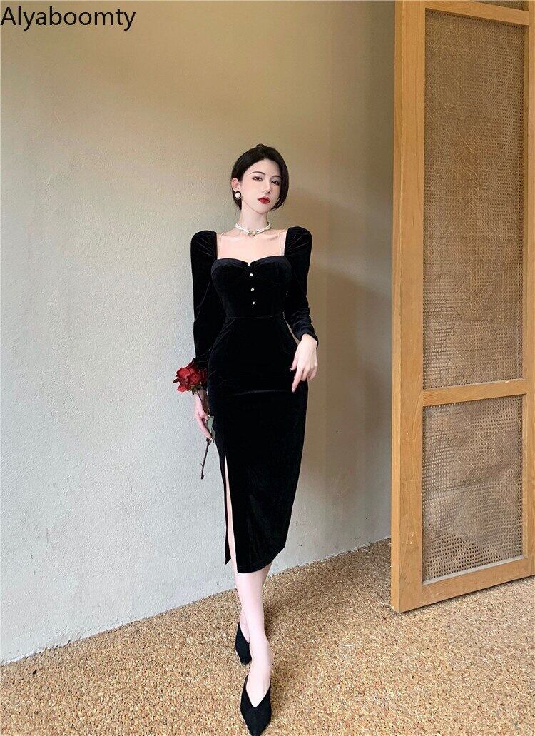 送料無料୨♥୧ スプリングオータムブラックロングドレス ベルベット長袖スリーブヴィンテージドレス ワンピース 春物 秋物 ビンテージ AOS88723317548