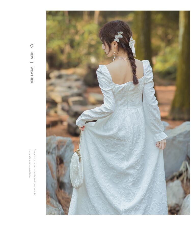 送料無料୨♥୧ スプリングオータムレディースホワイトドレス カラーフローラルジャカードスリーブウェスト 春物 秋物 花柄 スクウェア AOS15683014105