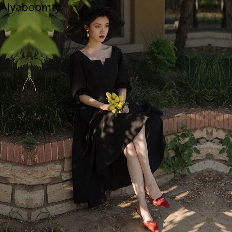 送料無料୨♥୧ サマーオータムレディースロングドレス カラーブラックレッドヴィンテージスリーブ 長袖 半袖 ハーフスリーブ 夏物 秋物 スクウェア ビンテージ AOS89552490578