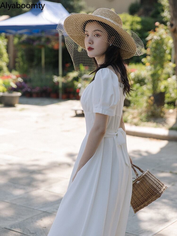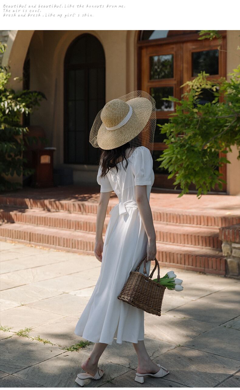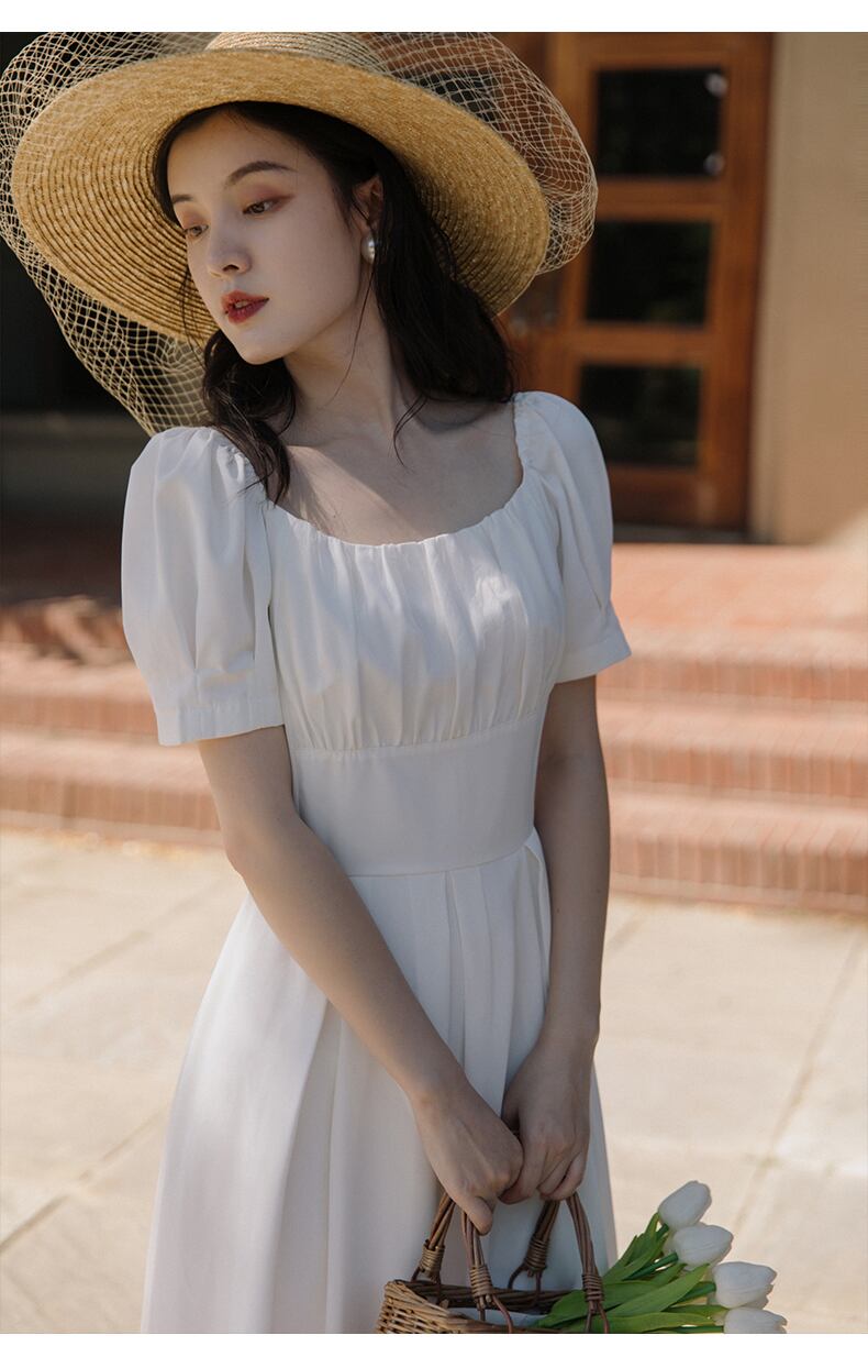 送料無料୨♥୧ スタイルサマーレディースソリッド ドレス カラーホワイトブラックレッドプリーツウェストスリーブロング 夏物 ソリッドカラー スクウェア ヨーロピアン AOS50827428904