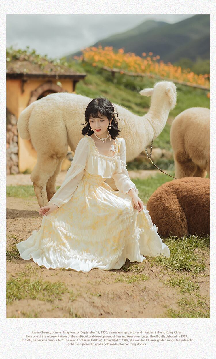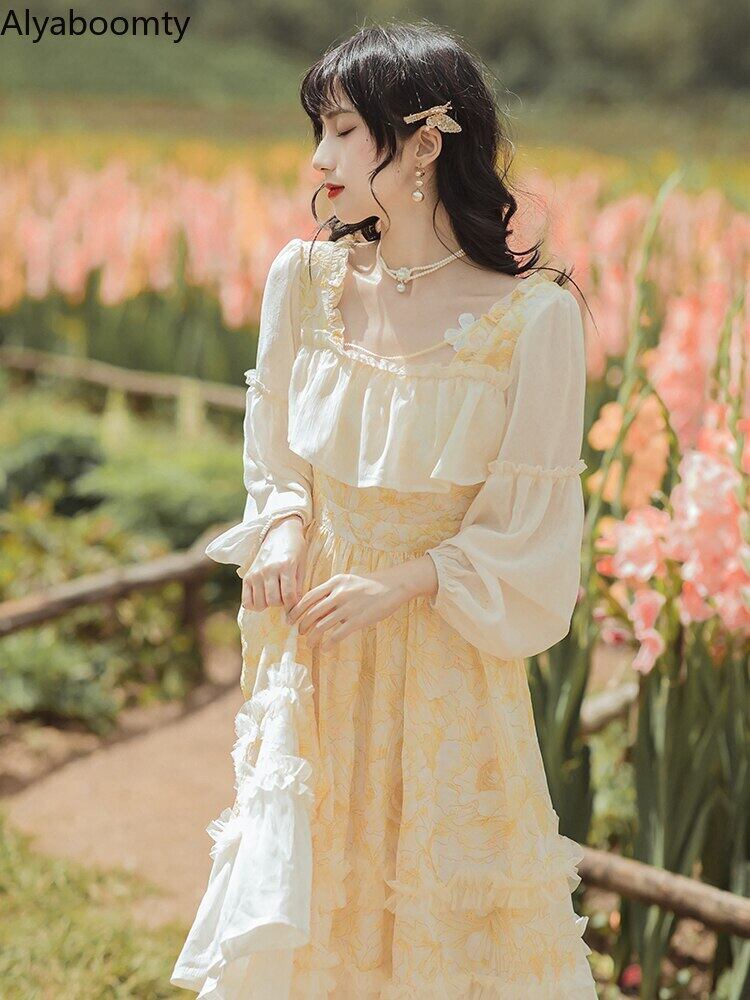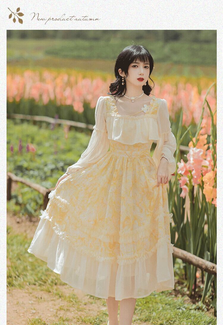 送料無料୨♥୧ スプリングオータムレディースロングドレス カラーイエロープリントシフォンフリル ラッフル 大人ガーリー スウィート キュート カジュアル 春物 秋物 スクウェア AOS31800201202