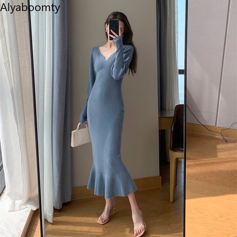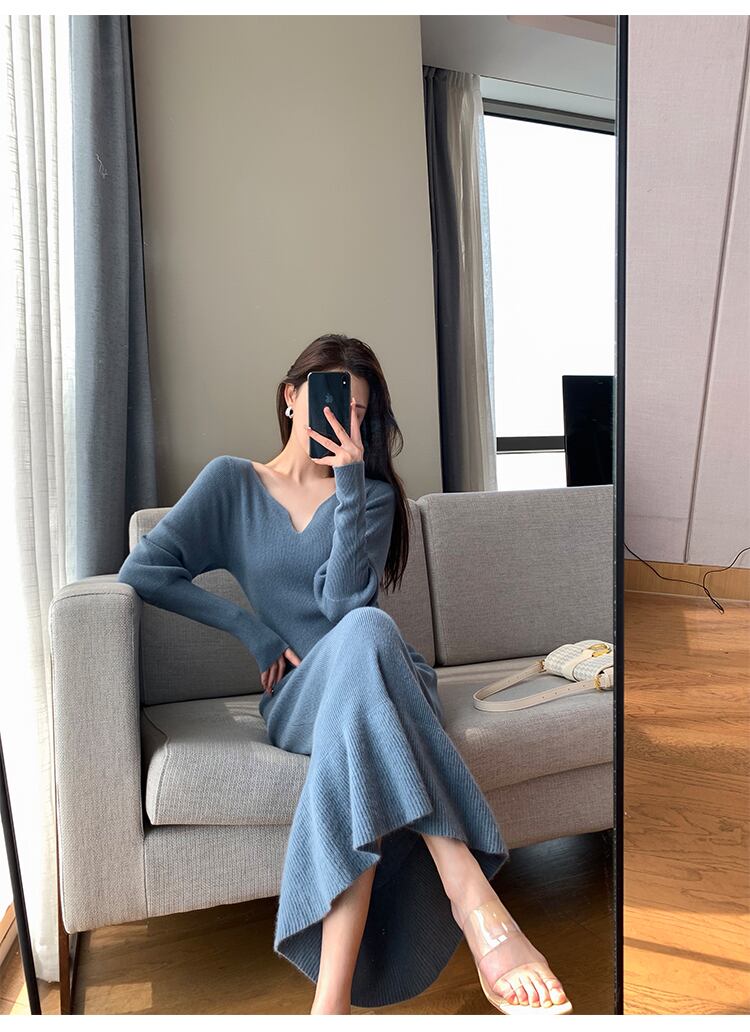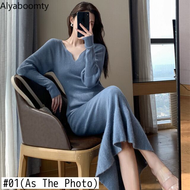 送料無料୨♥୧ オータムウィンターレディースセーター ドレス Vネックニット スリーブフリルミディ ブルー ランタンスリーブ ラッフル 秋物 冬物 AOS3837115468