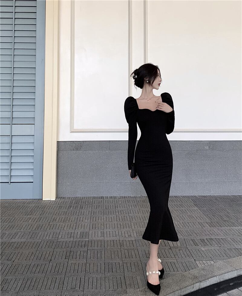 送料無料୨♥୧ スプリングオータムレディースブラックロングドレス カラーソリッド スリーブミディドレス ワンピース 春物 秋物 ソリッドカラー スクウェア AOS8467444798