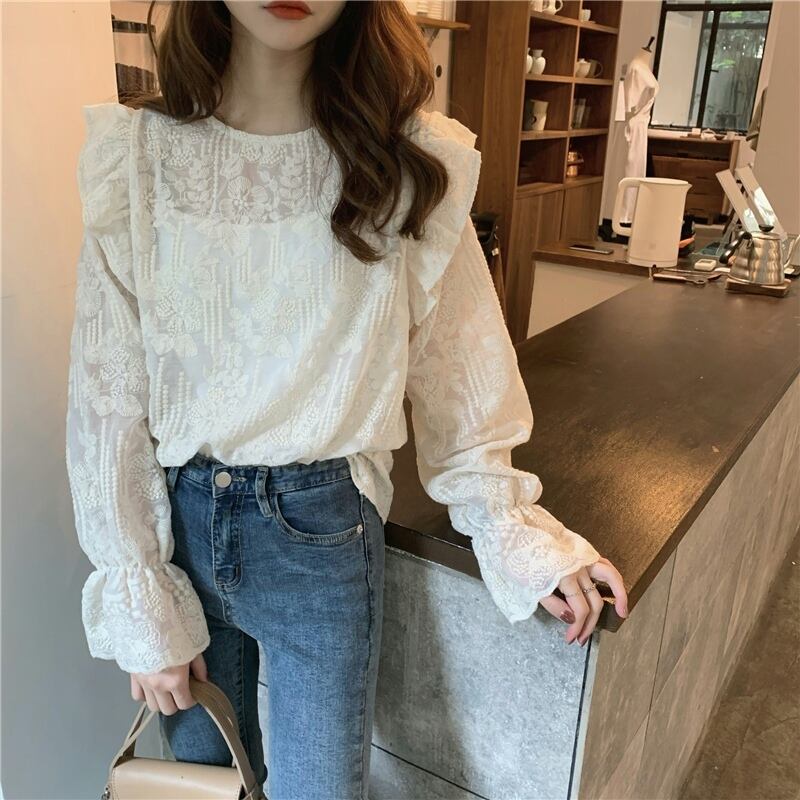 送料無料୨♥୧ スプリングオータムレディースレーストップス フローラル刺繍ブラウス 長袖スリーブ ロング 春物 秋物 花柄 Oネック AOS34381546741