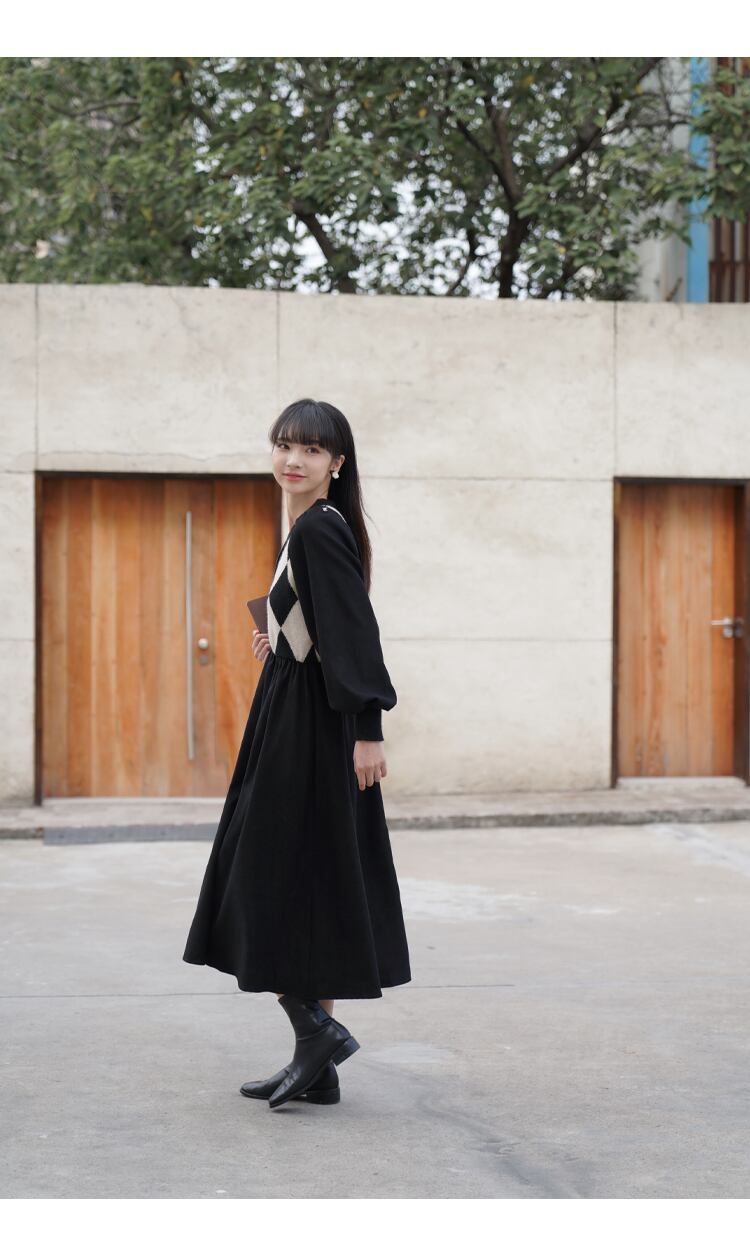 送料無料୨♥୧ オータムウィンターレディースミディブラックドレス Vネックニット パッチワークスリーブヴィンテージ 秋物 冬物 ビンテージ AOS50973655354