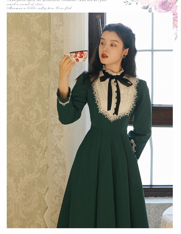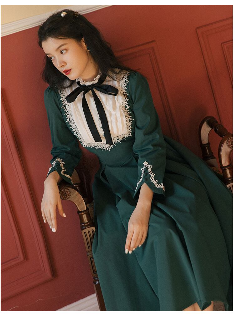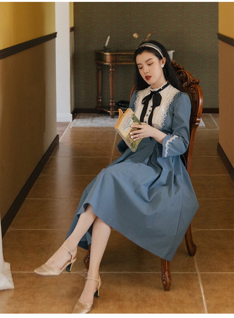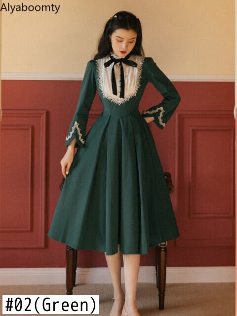送料無料୨♥୧ スタイルスプリングレディースミディドレス カラーブルーグリーンパッチワークレースヴィンテージウェスト 春物 ビンテージ ヨーロピアン AOS61478936901