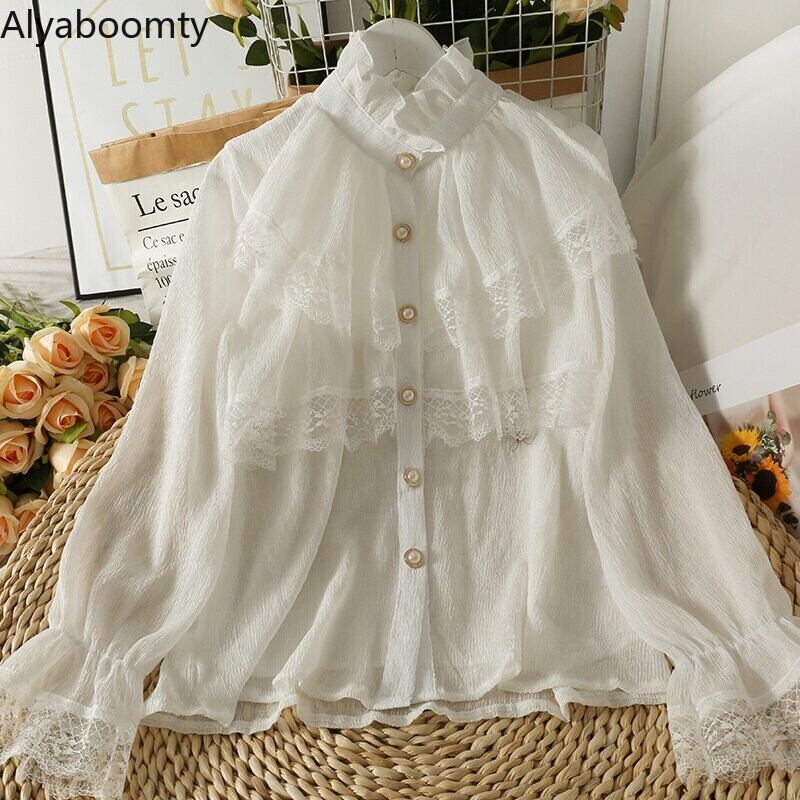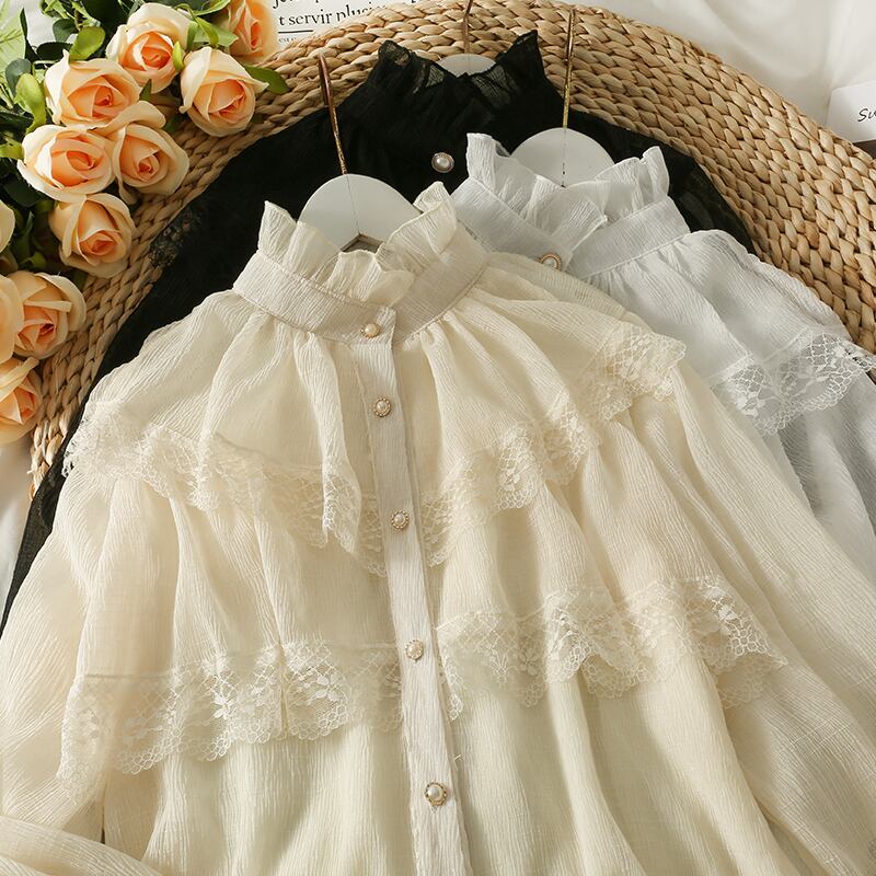 送料無料୨♥୧ スプリングオータムレディースブラウス ホワイトブラックレースフリルシャツ ラッフル 大人ガーリー スウィート キュート カジュアル 春物 秋物 AOS32321188251