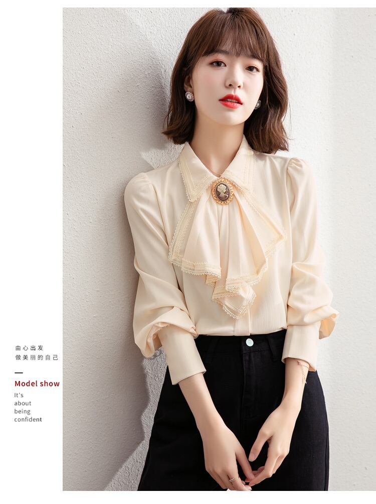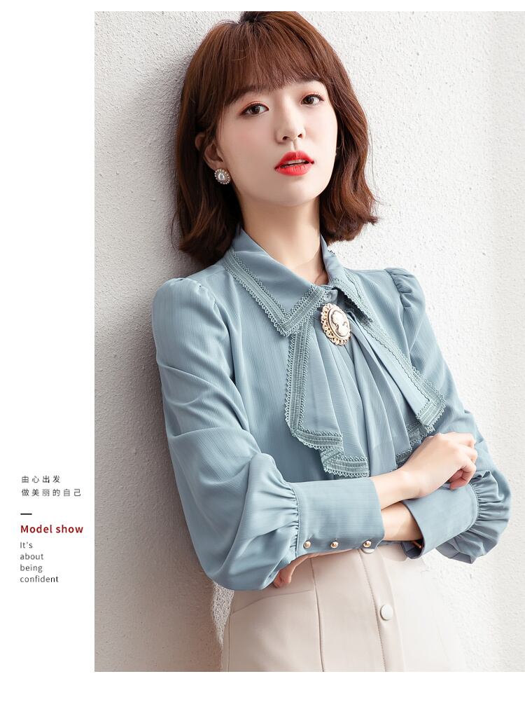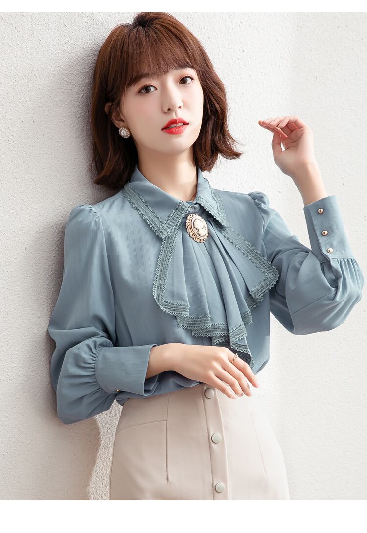 送料無料୨♥୧ スプリングオータムレディースシャツ カラーブルーブラウス 長袖スリーブシフォン ロング 大人ガーリー スウィート キュート カジュアル 春物 秋物 AOS38960186477