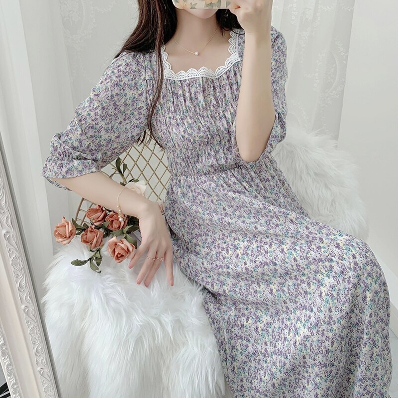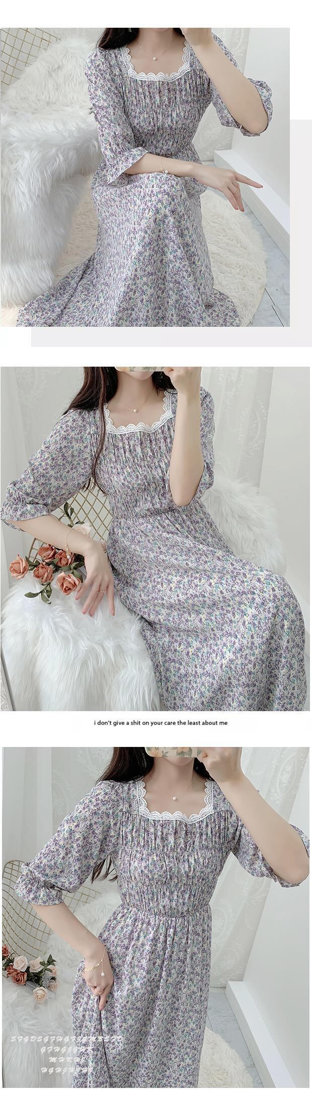 送料無料୨♥୧ サマーレディースドレス カラーレースフローラルプリント半袖スリーブシフォン ハーフスリーブ 夏物 花柄 パープル スクウェア AOS58392903759