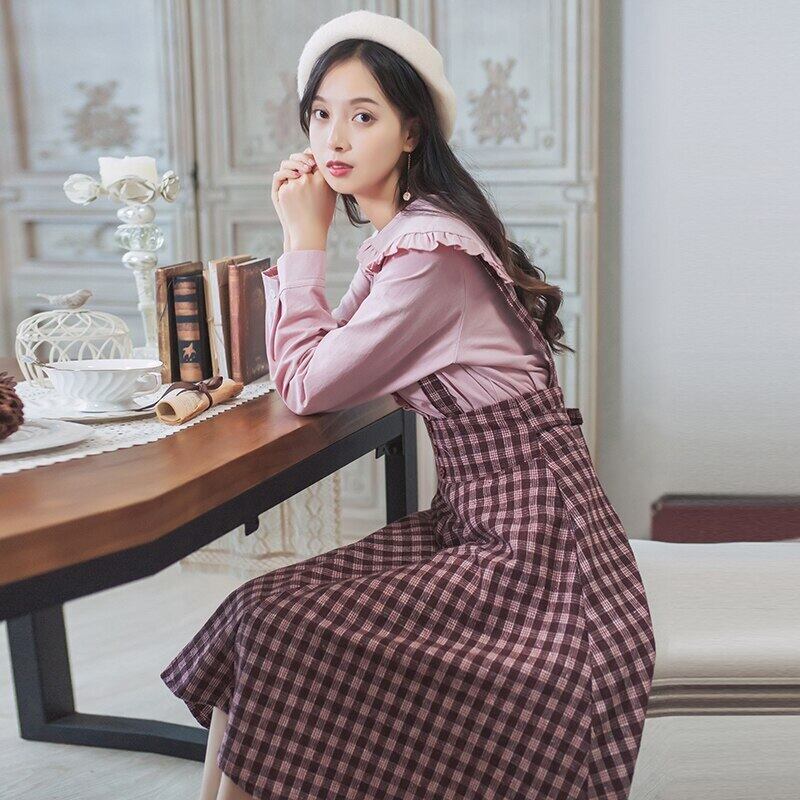 送料無料୨♥୧ スプリングオータムレディースセット フリルシャツ 格子柄ドレス スカート ピンク ラッフル 大人ガーリー スウィート キュート カジュアル 春物 秋物 AOS54678918901