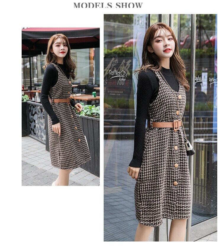 送料無料୨♥୧ スタイルオータムウィンターレディースドレス Vネック格子柄ウールノースリーブ 秋物 冬物 ヨーロピアン AOS11426935141