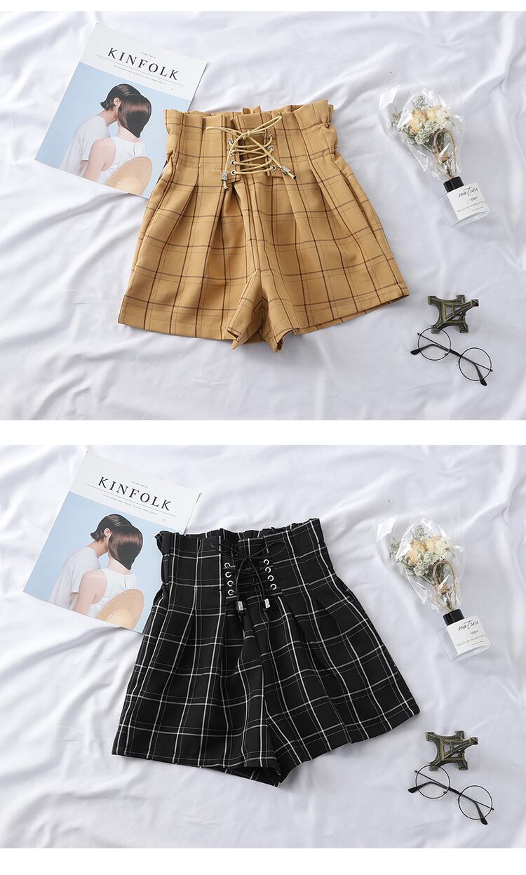 送料無料୨♥୧ サマーレディースストリートウェアショーツ ウェストカーキブラックバンドルーズ格子柄 かわいい 夏物 ブルマー AOS54420801748