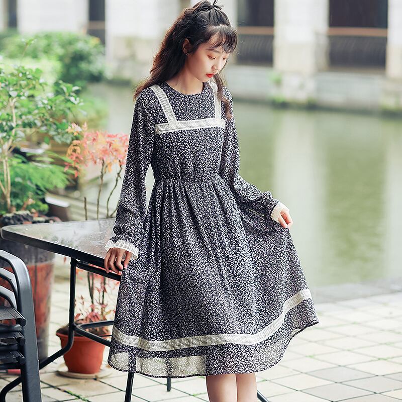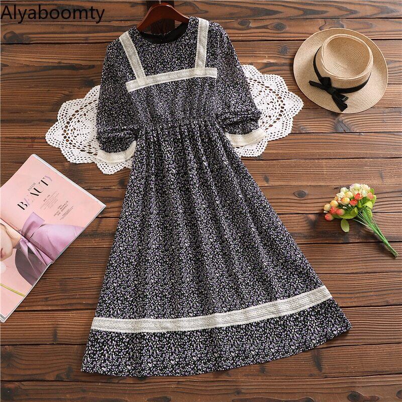 送料無料୨♥୧ オータムレディースヴィンテージドレス パッチワークフローラルプリントレースシフォン 秋物 花柄 ビンテージ AOS53823013798
