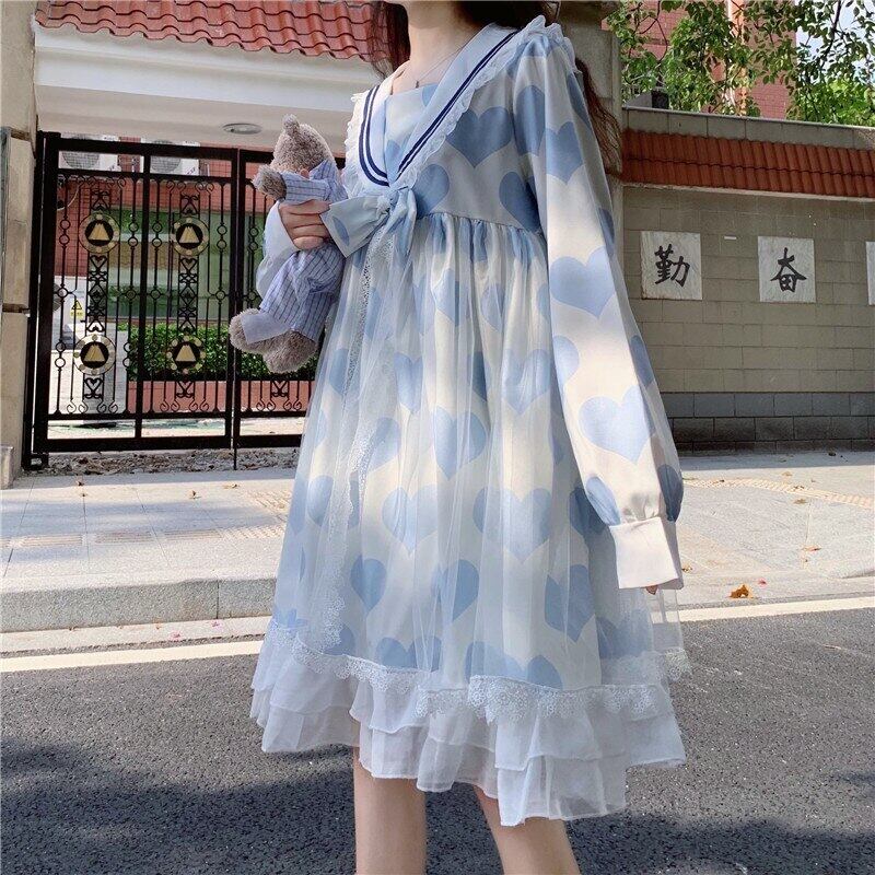 送料無料୨♥୧ スタイルレディースドレス カラーリボンハートプリントメッシュレースフリル ラッフル 大人ガーリー スウィート キュート カジュアル AOS57605685258