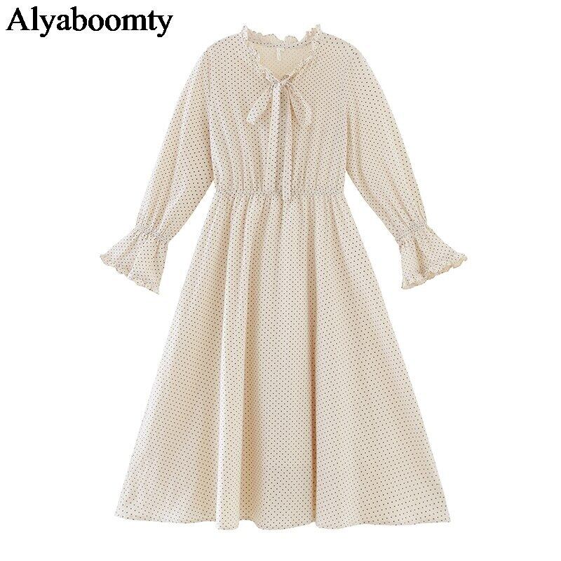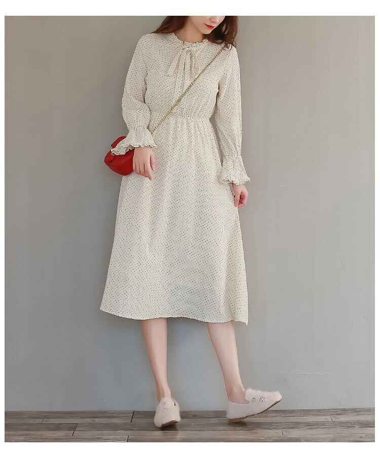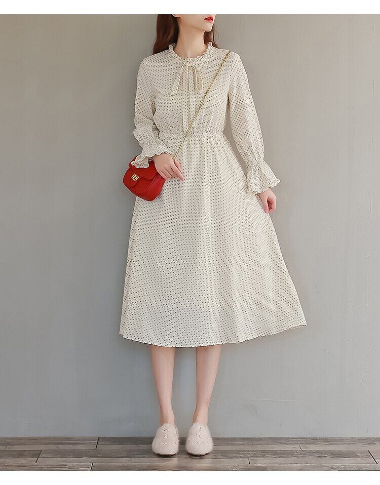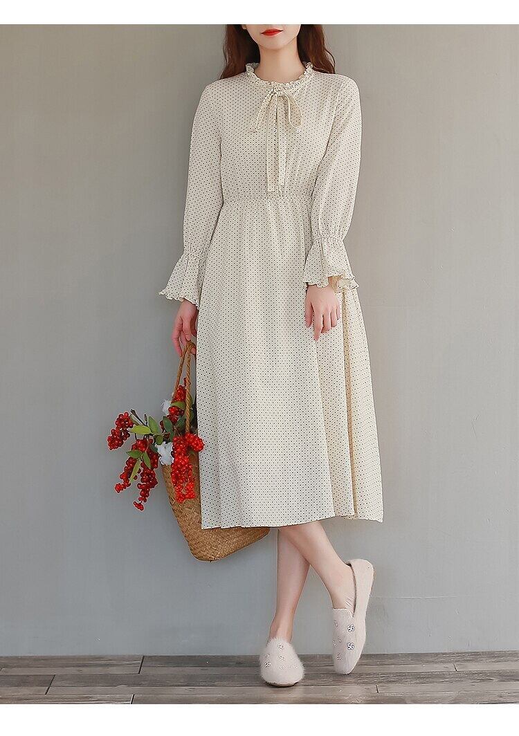 送料無料୨♥୧ オータムレディースミディドレス 水玉スリーブ フレアスリーブ コットン エラスティック 伸縮 大人ガーリー スウィート キュート カジュアル 秋物 AOS42177541114