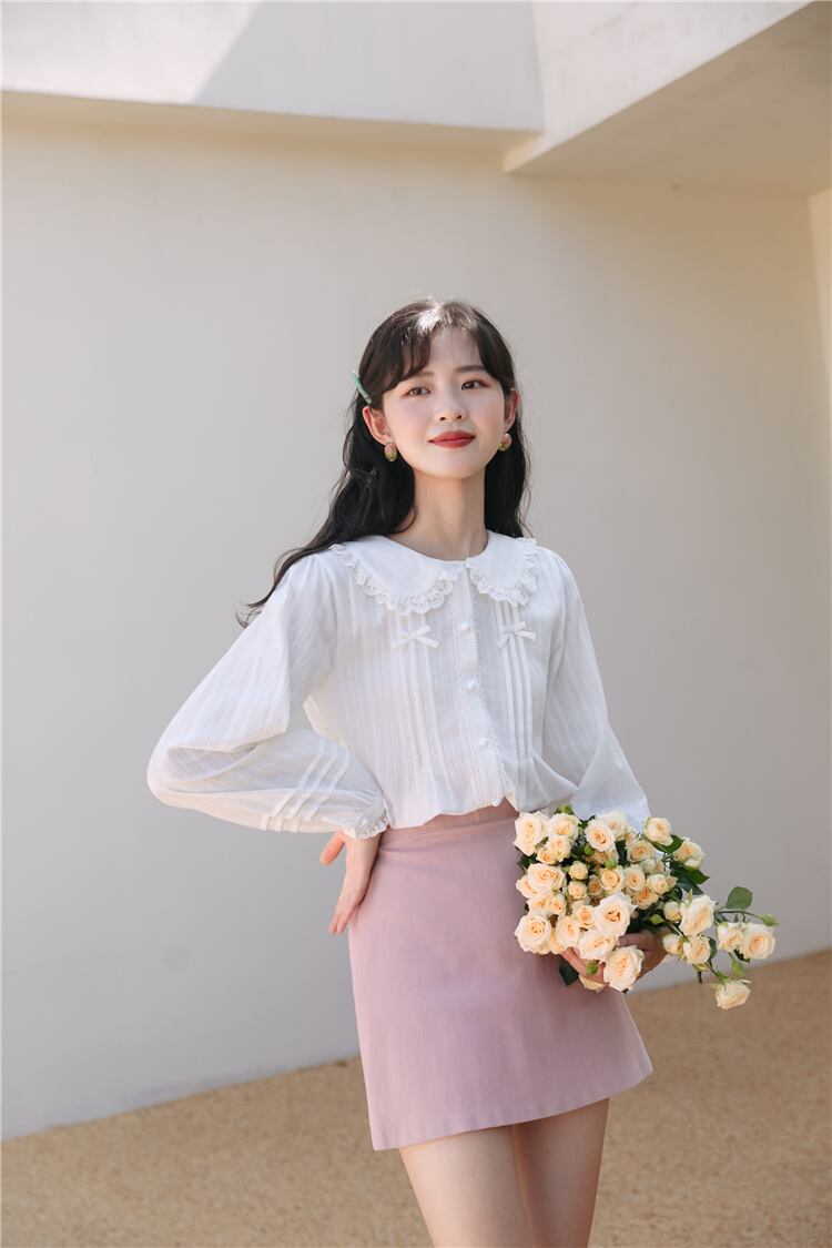 送料無料୨♥୧ スプリングオータムレディースブラウス カラーホワイトリボンシャツ フリル コットン ラッフル 大人ガーリー スウィート キュート カジュアル 春物 秋物 AOS7664834688