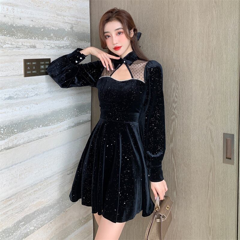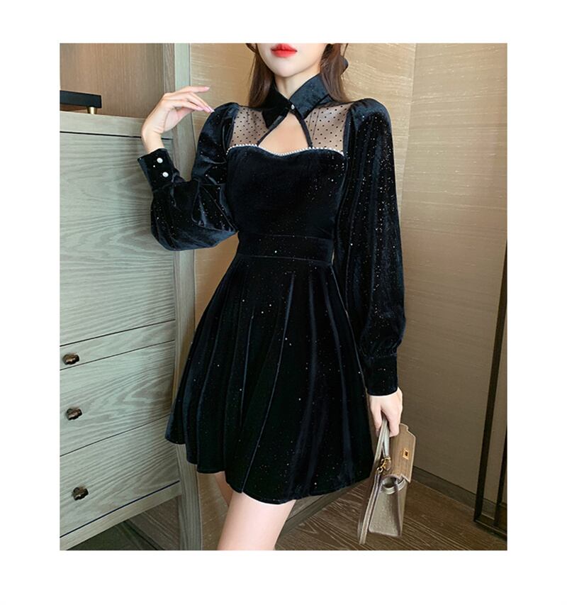 送料無料୨♥୧ スプリングオータムレディースブラックミニドレス メッシュパッチワーク長袖スリーブベルベット ロング 春物 秋物 AOS91562086672