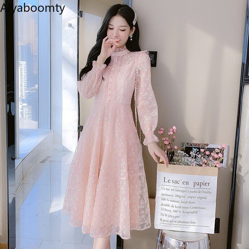 送料無料୨♥୧ スプリングオータムレディースミディドレス カラーフローラルレーススリーブメッシュ ピンク 春物 秋物 花柄 AOS88288585638
