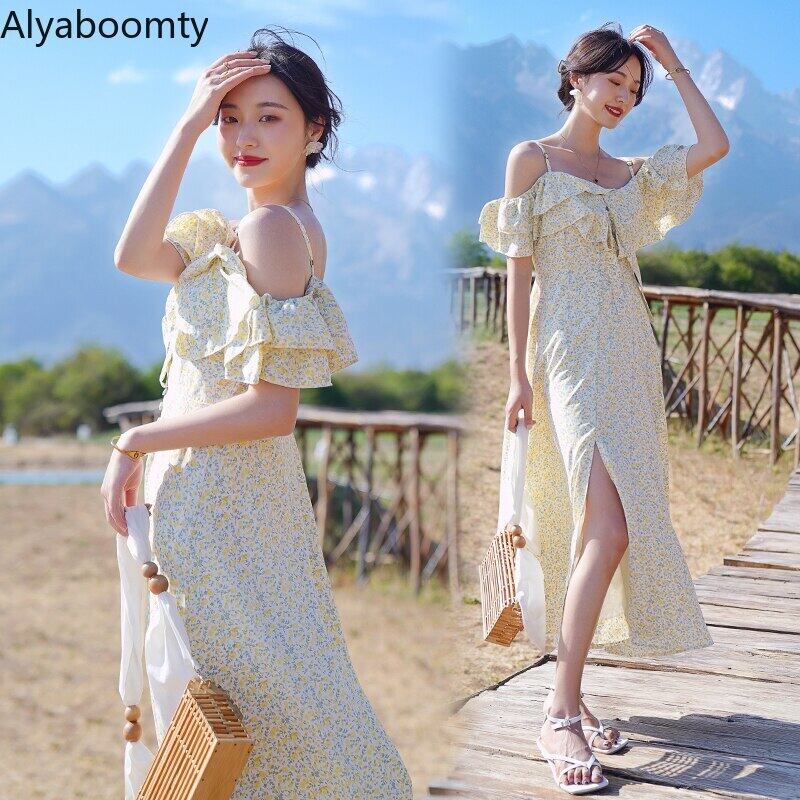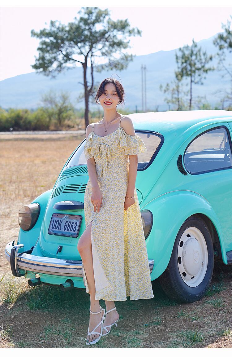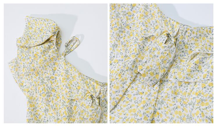 送料無料୨♥୧ サマーレディースロングドレス オフショルダーフリルイエローフローラルプリントシフォン ラッフル 夏物 花柄 AOS10168251072