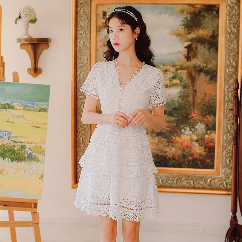 送料無料୨♥୧ サマーレディースホワイトミニドレス Vネックレース半袖スリーブフリルドレス ワンピース ショート レッド ハーフスリーブ ラッフル 夏物 AOS55951378664