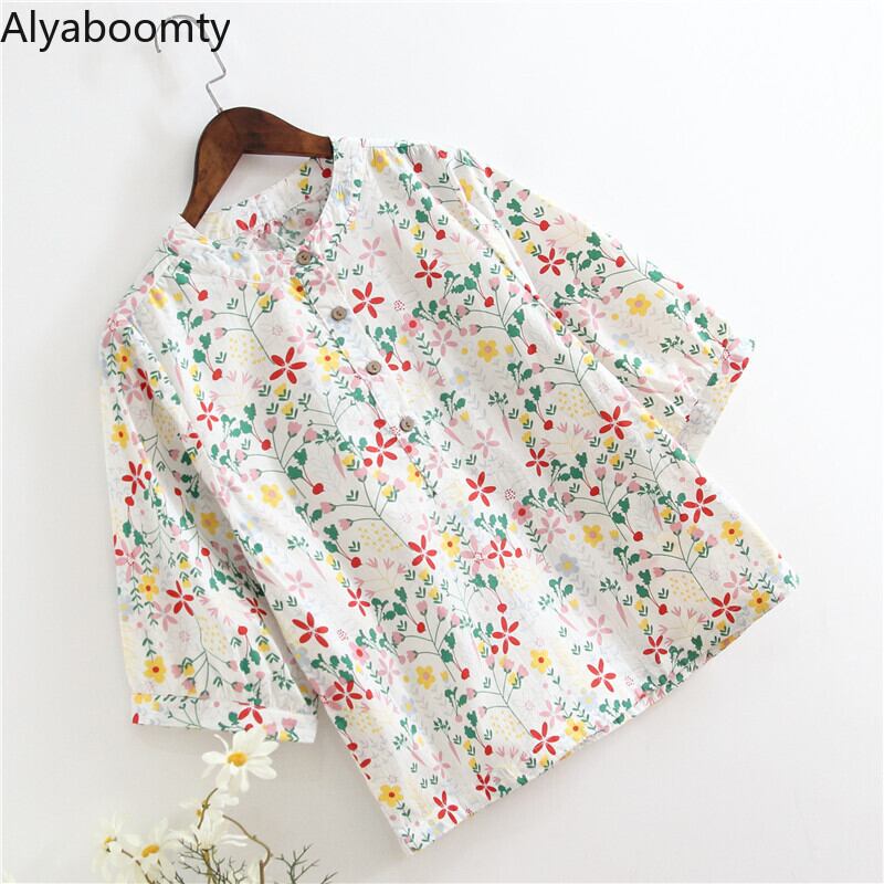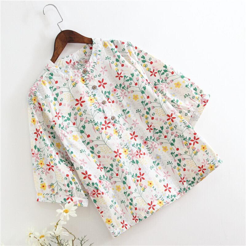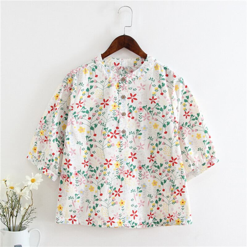 送料無料୨♥୧ サマーレディーストップス フローラルプリント七部袖スリーブブラウス コットン 大人ガーリー スウィート キュート カジュアル 夏物 花柄 Oネック ナチュラル 天然 AOS64275964553