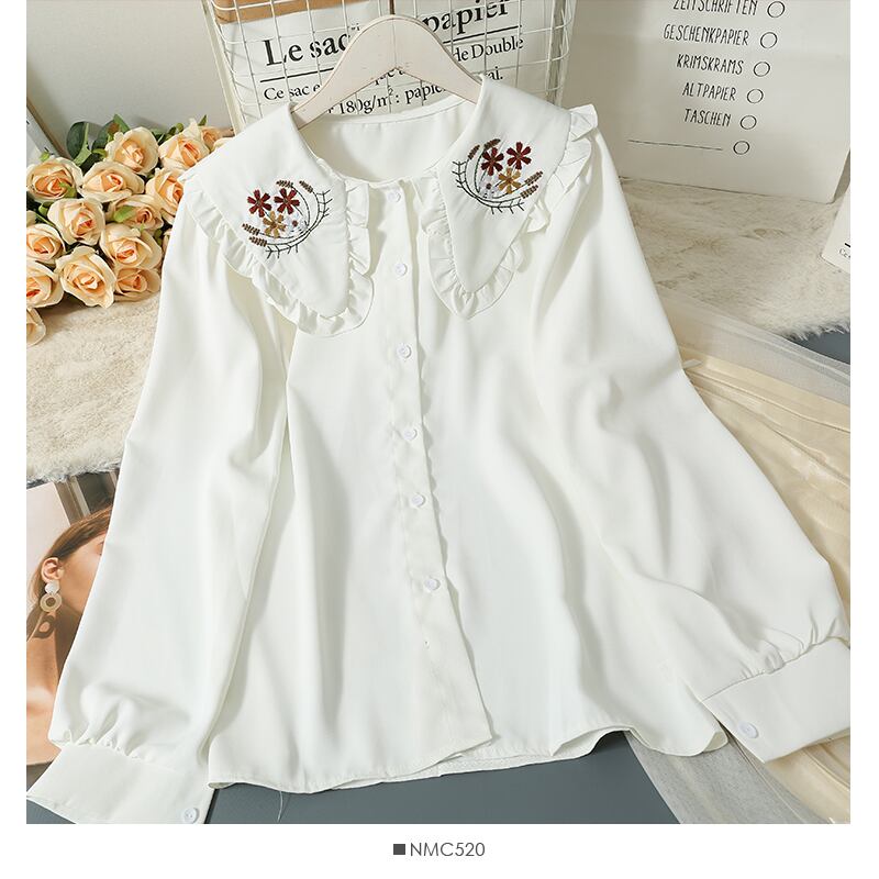 送料無料୨♥୧ スプリングオータムレディースブラウス カラーホワイトブルーシャツ フローラル刺繍 ピンク 大人ガーリー スウィート キュート カジュアル 春物 秋物 花柄 AOS19971396656