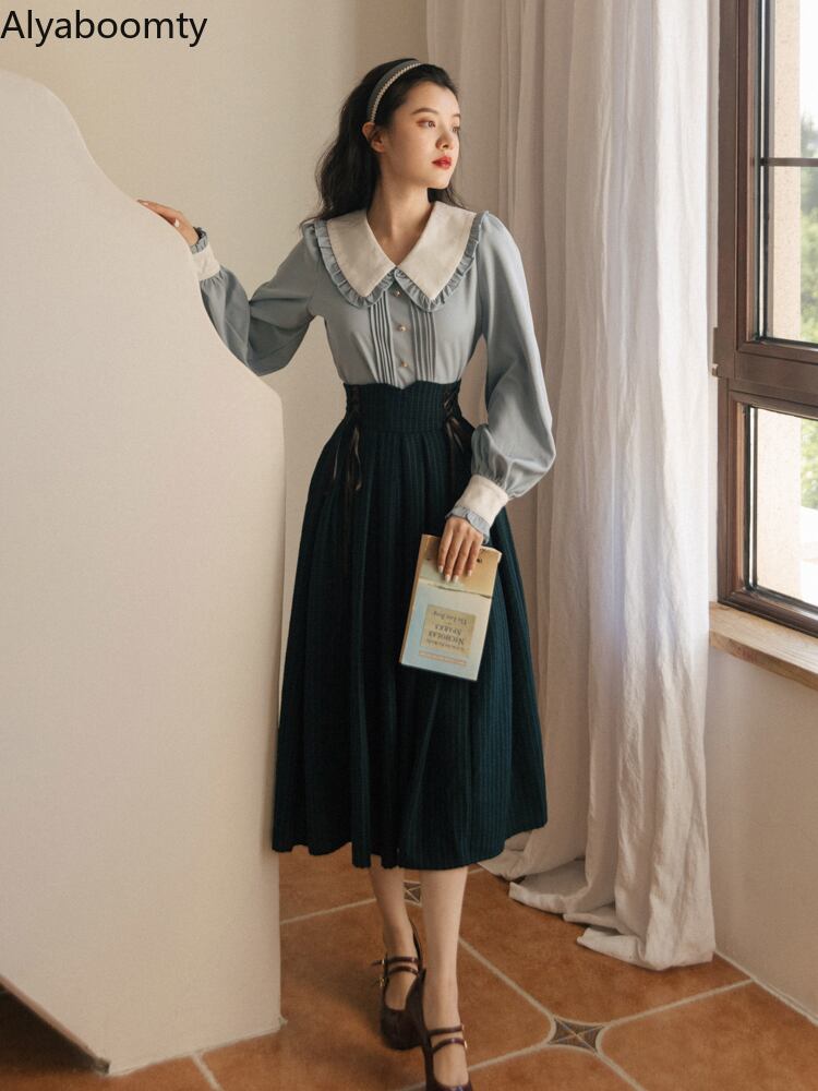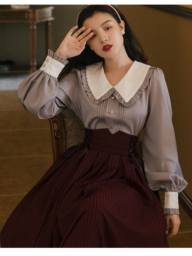送料無料୨♥୧ スタイルスプリングオータムレディースセット カラースリーブバンドミディスカート ランタンスリーブ ブラウス 春物 秋物 ストライプ ヨーロピアン AOS52042895476