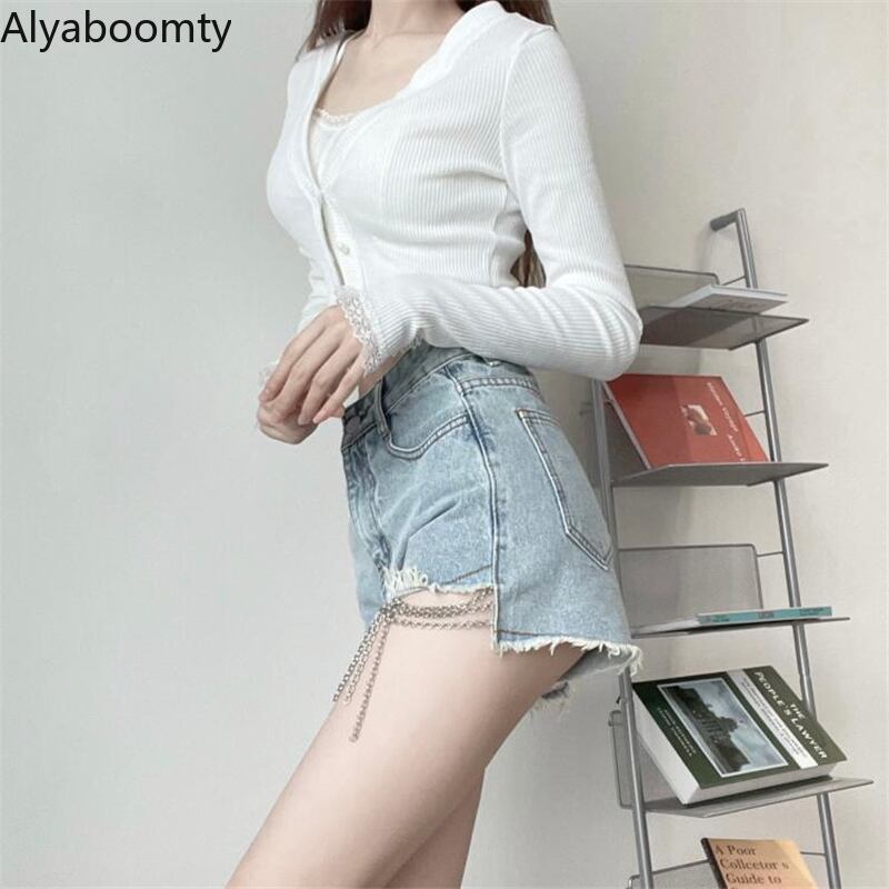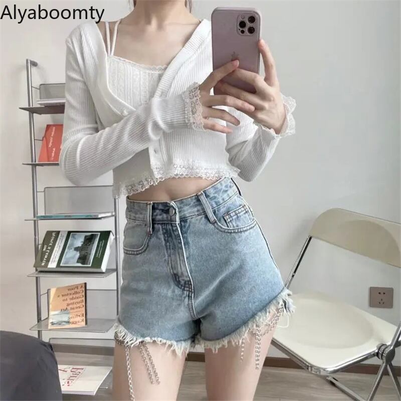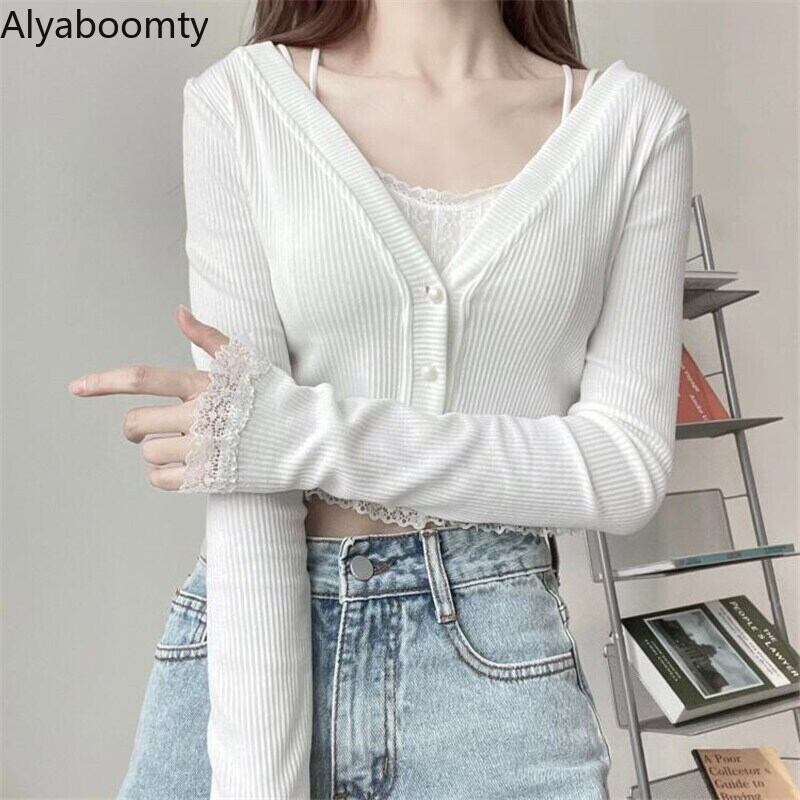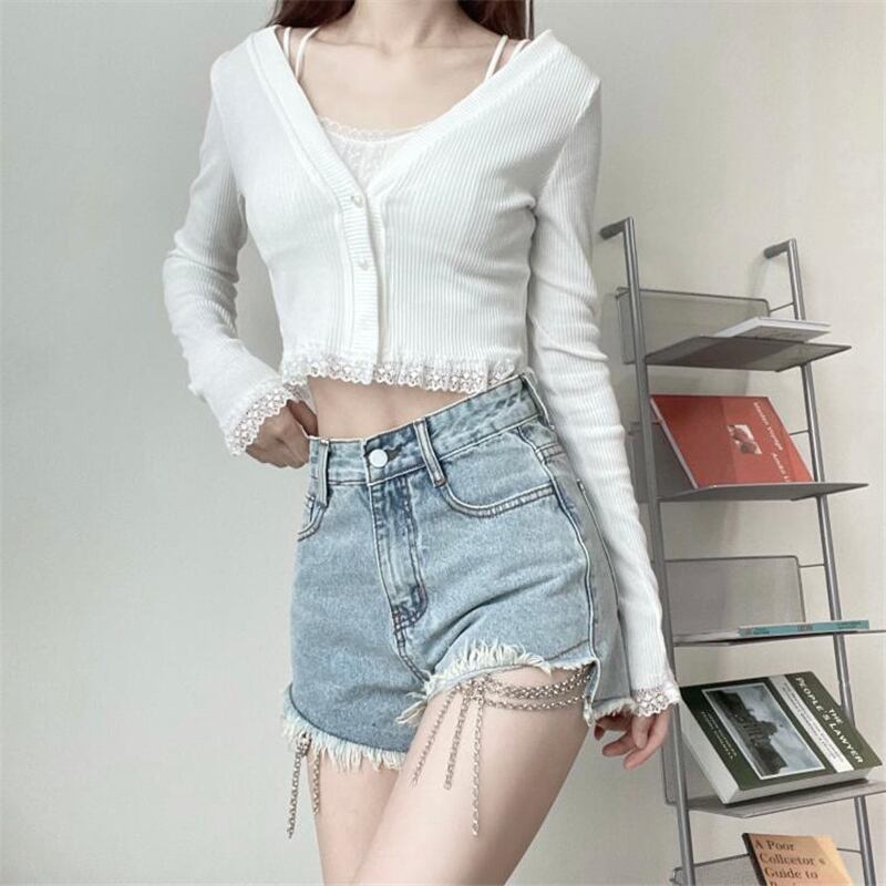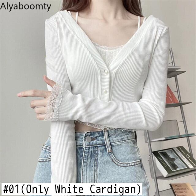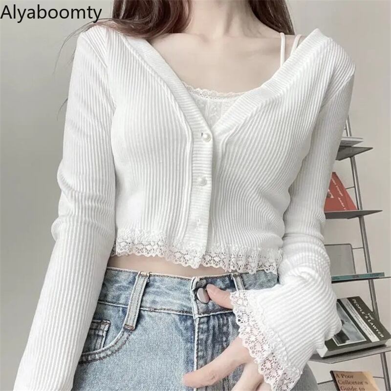 送料無料୨♥୧ スプリングサマーレディースショートカーディガンVネックホワイトニットクロップトップ トップス 長袖スリーブレースフリル薄手ニット ロング ラッフル 春物 夏物 AOS25393919626