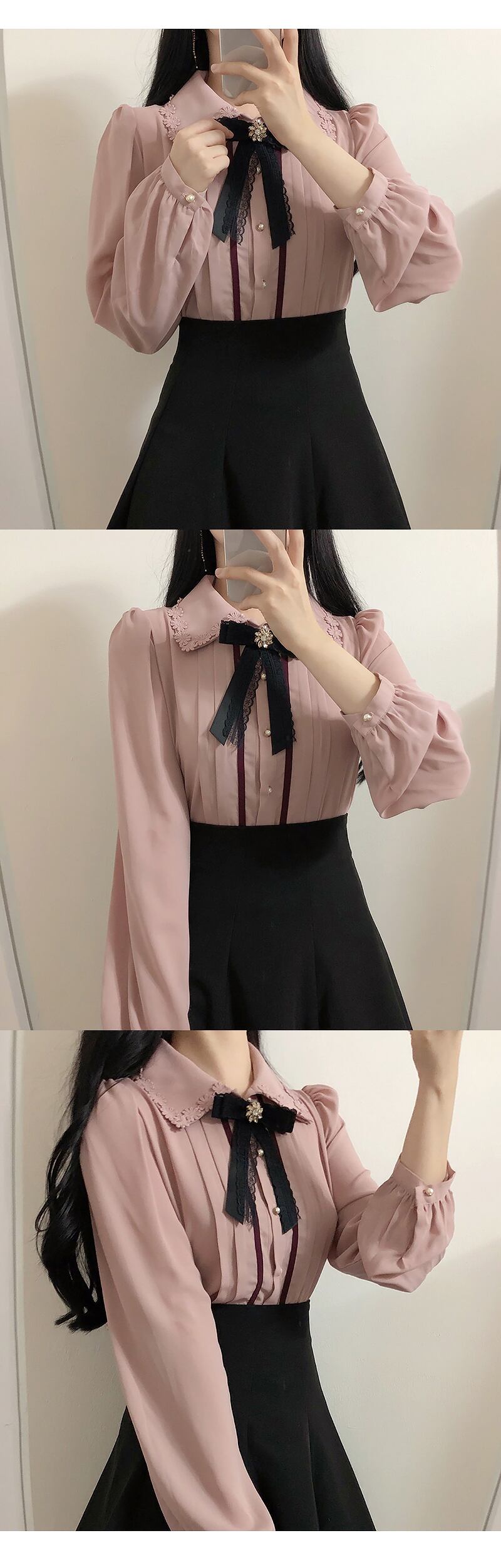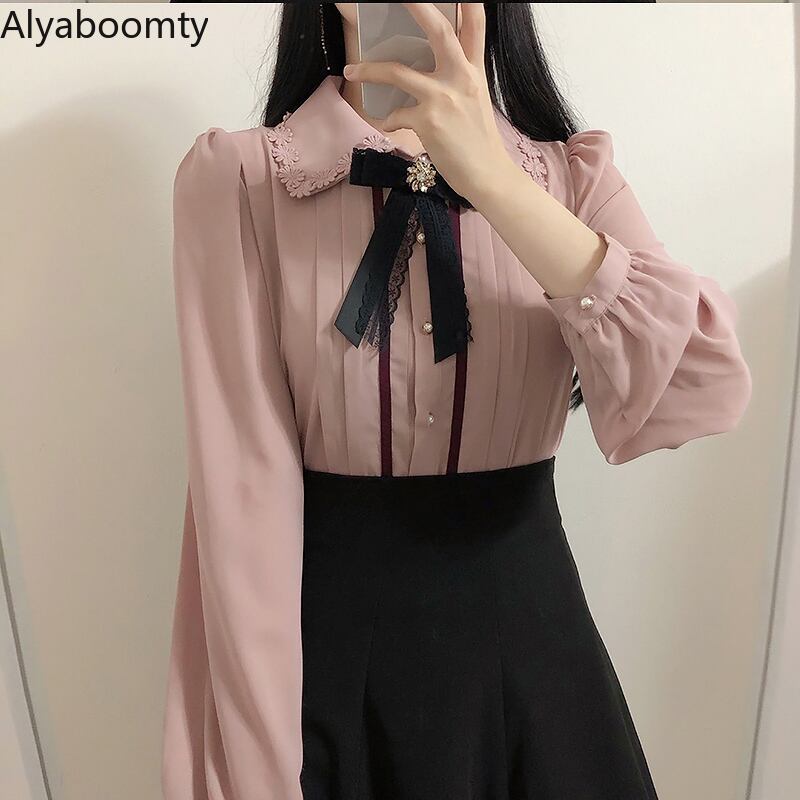 送料無料୨♥୧ スプリングオータムレディースシャツ カラーベージュフローラルリボンブラウス ピンク 大人ガーリー スウィート キュート カジュアル 春物 秋物 花柄 会社 学校 通勤や通学にも AOS36248522574