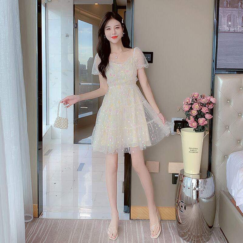 送料無料୨♥୧ サマーレディースミニメッシュドレス カラーハートスリーブ 大人ガーリー スウィート キュート カジュアル 夏物 スクウェア AOS80657753567