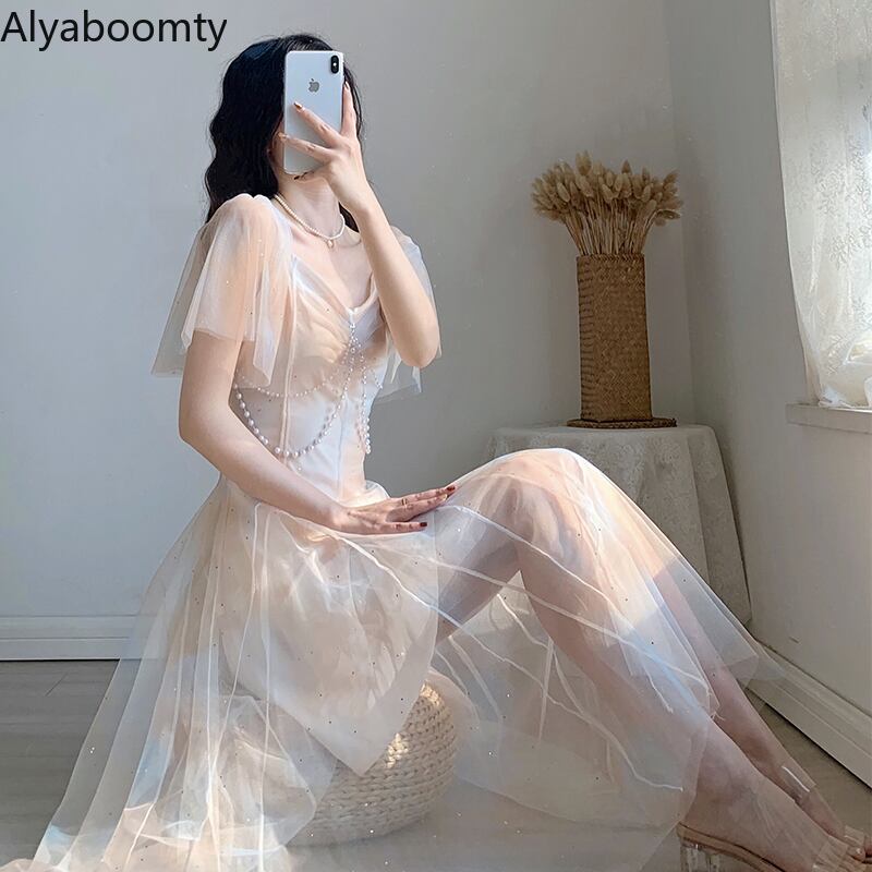送料無料୨♥୧ サマーレディースメッシュミディドレス Vネックカラースリーブ 夏物 AOS56159321715