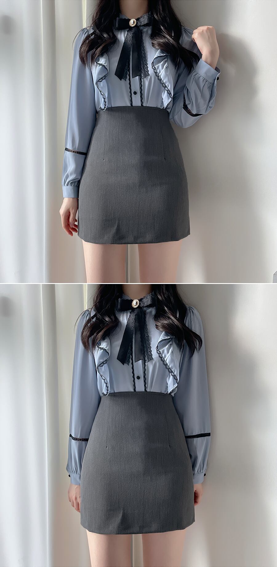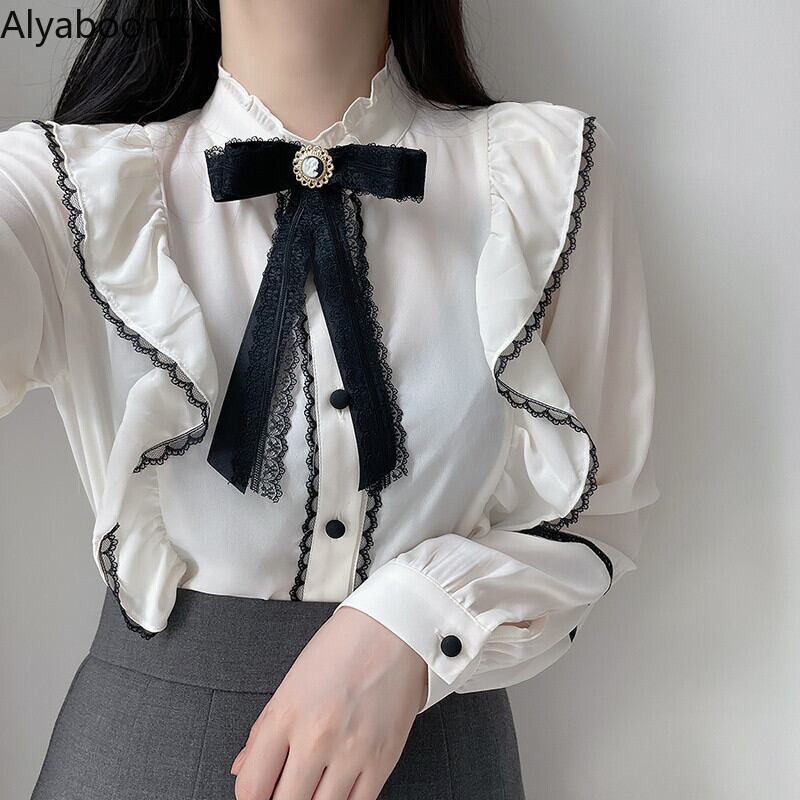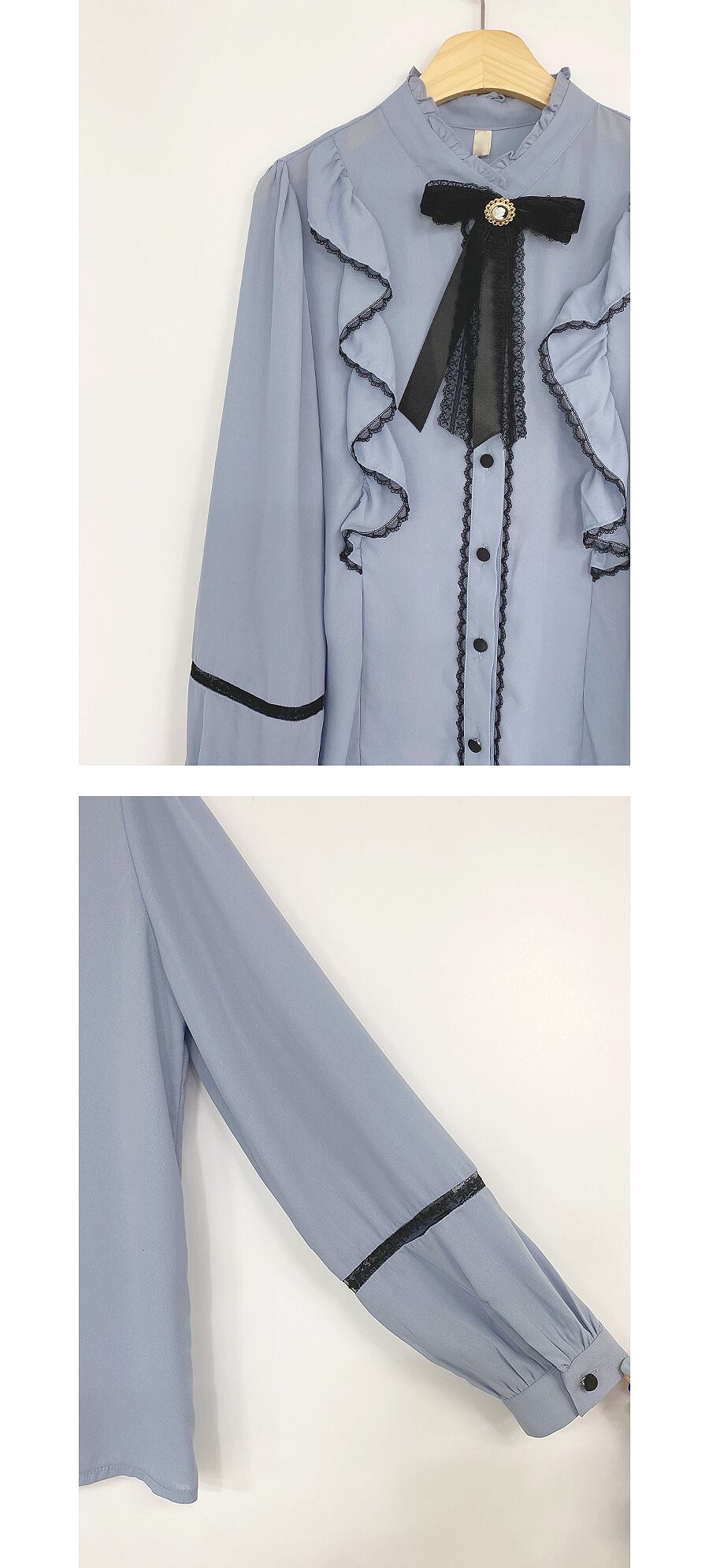 送料無料୨♥୧ スプリングオータムスタイルスタンドカラーカラーホワイトブルーリボンフリルブラウス 長袖スリーブソリッド シャツ ロング ラッフル 大人ガーリー スウィート キュート カジュアル 春物 秋物 ソリッドカラー ヨーロピアン AOS46036818076